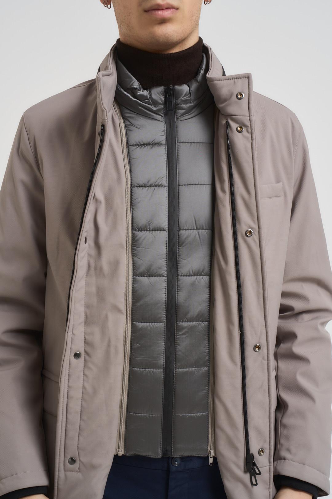 ADIMARI Giubbotto trench uomo grigio chiaro. Modello collo alto con pettorina trapuntata removibile da zip, chiusura con bottoni e spacco centrale. Due tasche con pattina laterali e una a filetto sul petto. Composizione: 100% poliestere. Il modello è alto 190cm e indossa la taglia L.