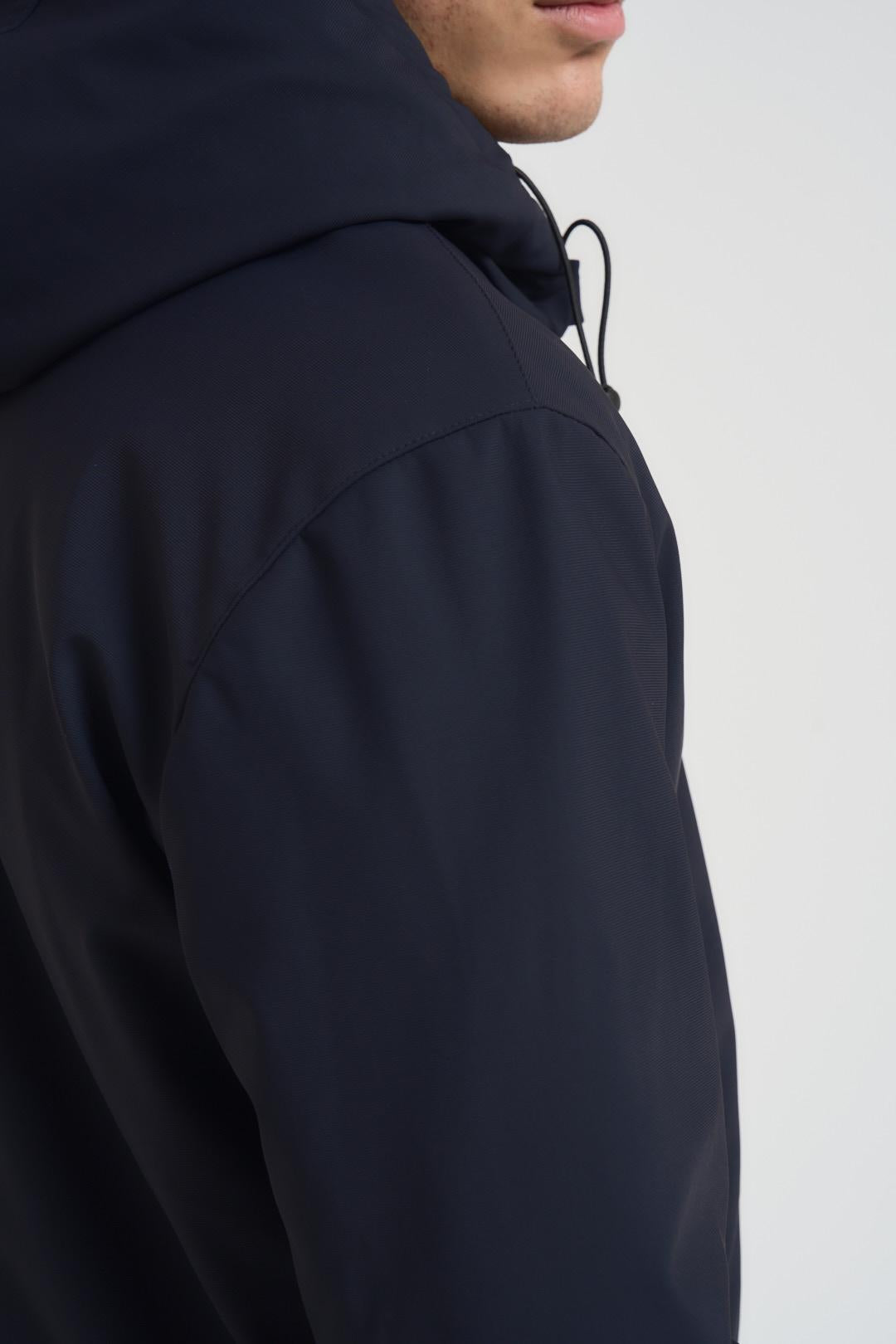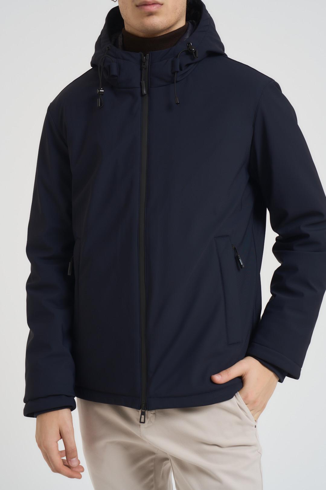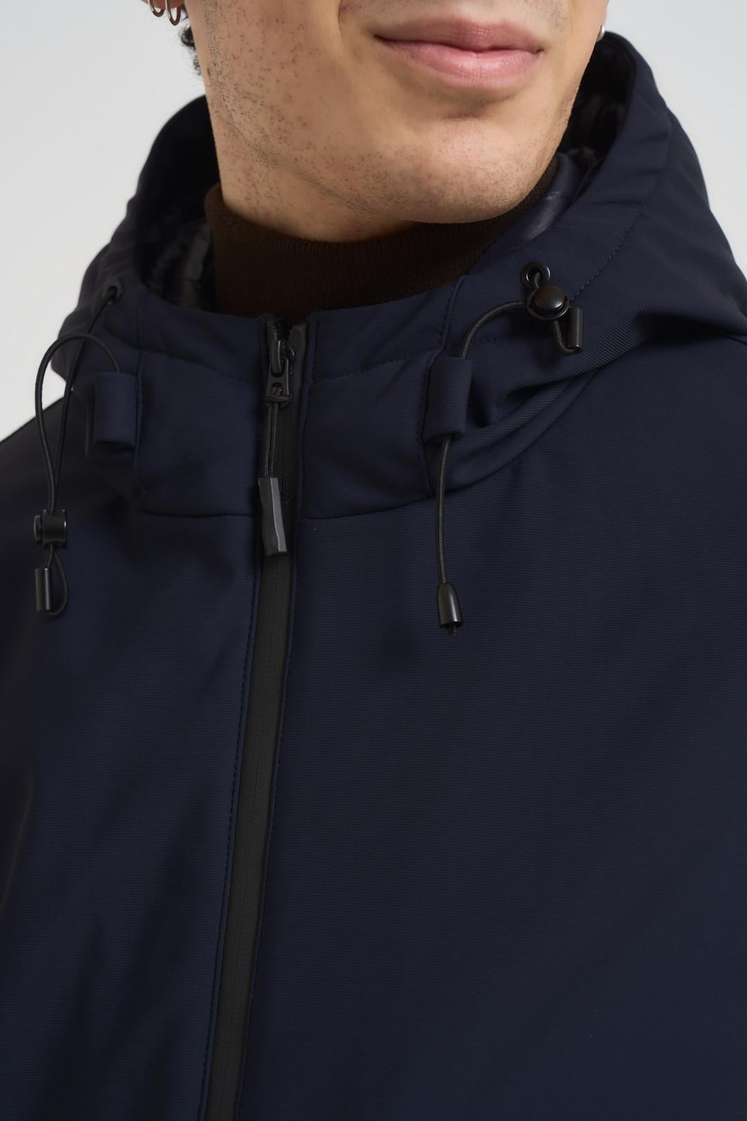 ADIMARI Giubbotto uomo blu notte. Modello in tessuto tecnico con cappuccio fisso, chiusura con zip centrale e due tasche a filetto con zip laterali. Composizione: poliestere. Il modello è alto 190cm e indossa la taglia L.
