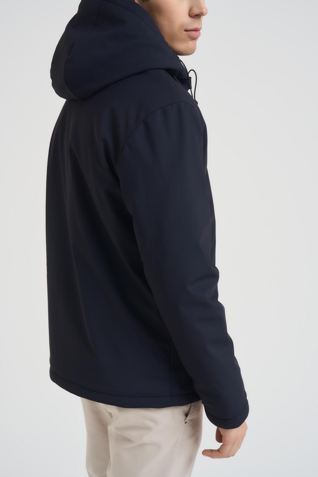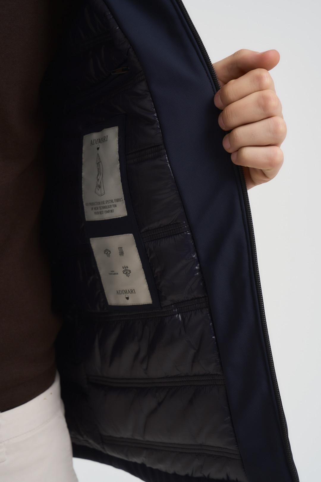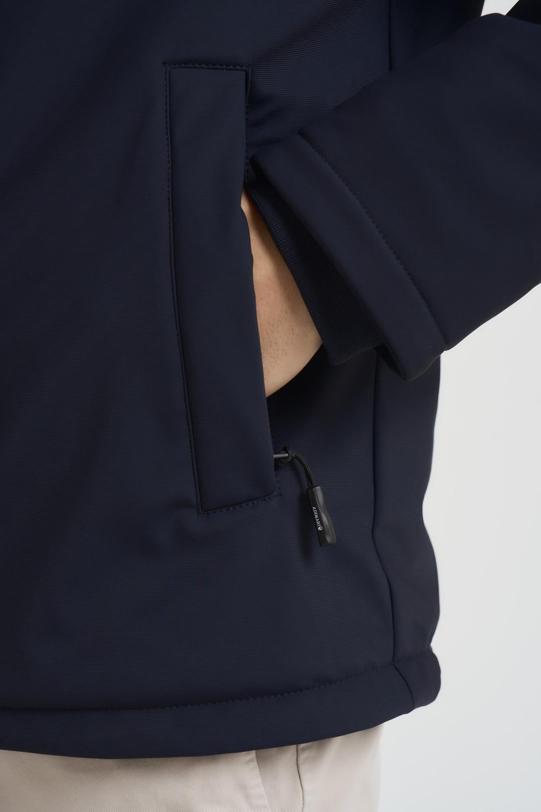 ADIMARI Giubbotto uomo blu notte. Modello in tessuto tecnico con cappuccio fisso, chiusura con zip centrale e due tasche a filetto con zip laterali. Composizione: poliestere. Il modello è alto 190cm e indossa la taglia L.