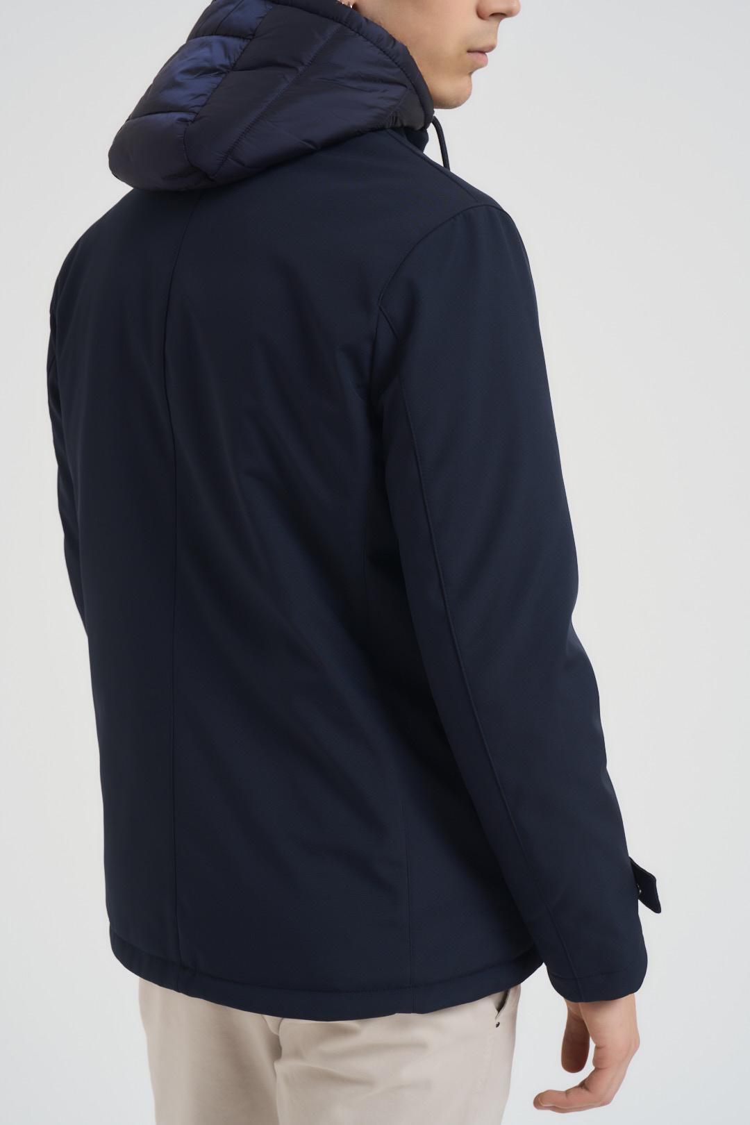 ADIMARI Giubbotto uomo con cappuccio blu notte. Modello in tessuto tecnico con cappuccio fisso e coulisse, chiusura con zip centrale e bottoni, due tasche a filetto con zip laterali. Composizione: poliestere. Il modello è alto 190cm e indossa la taglia L.