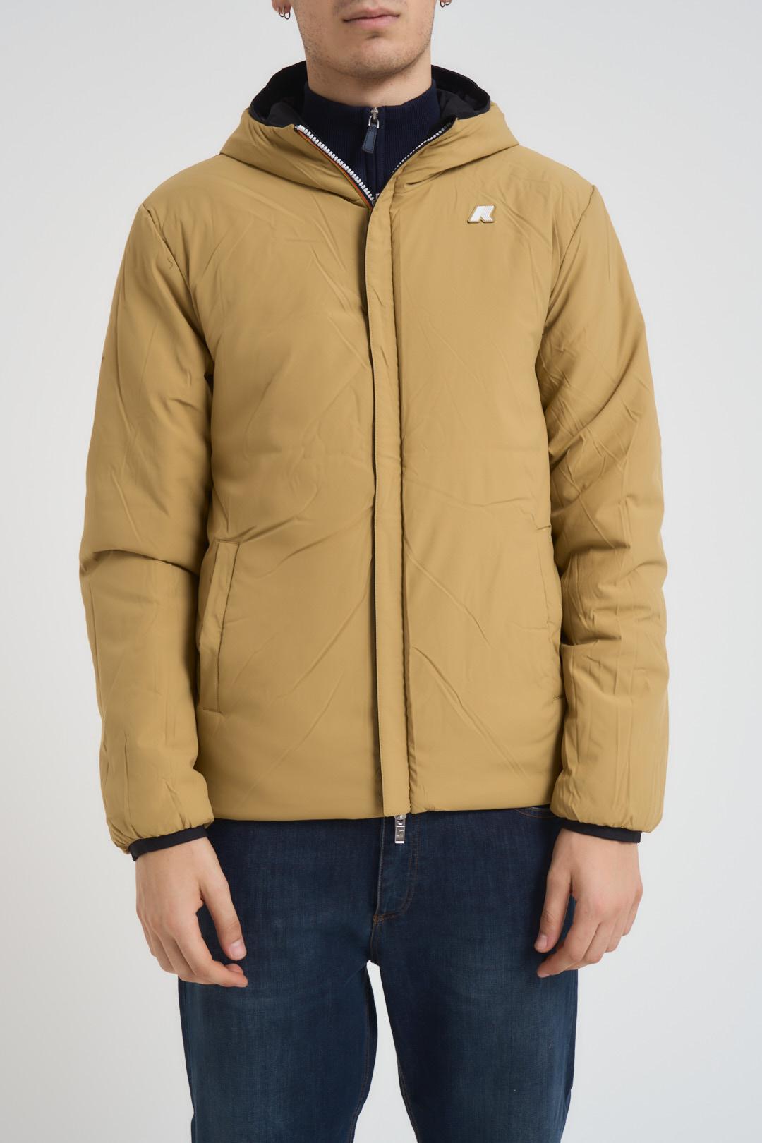 K-WAY Giubbotto uomo double face nero e beige. Modello impermeabile, idrorepellente, antivento, traspirante, con cappuccio regolabile da coulisse. Reversibile con interno verde. Cuciture termonastrate. Chiusura con zip e polsini con elastico. Due tasche con zip. Imbottitura: 100% Poliestere. Esterno: 8% Elastan 92% Nylon. Il modello è alto 190cm e indossa la taglia L.
