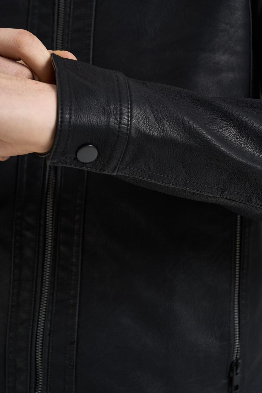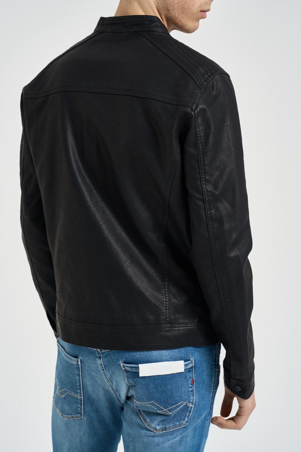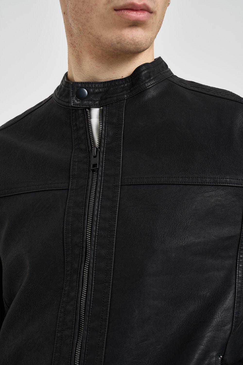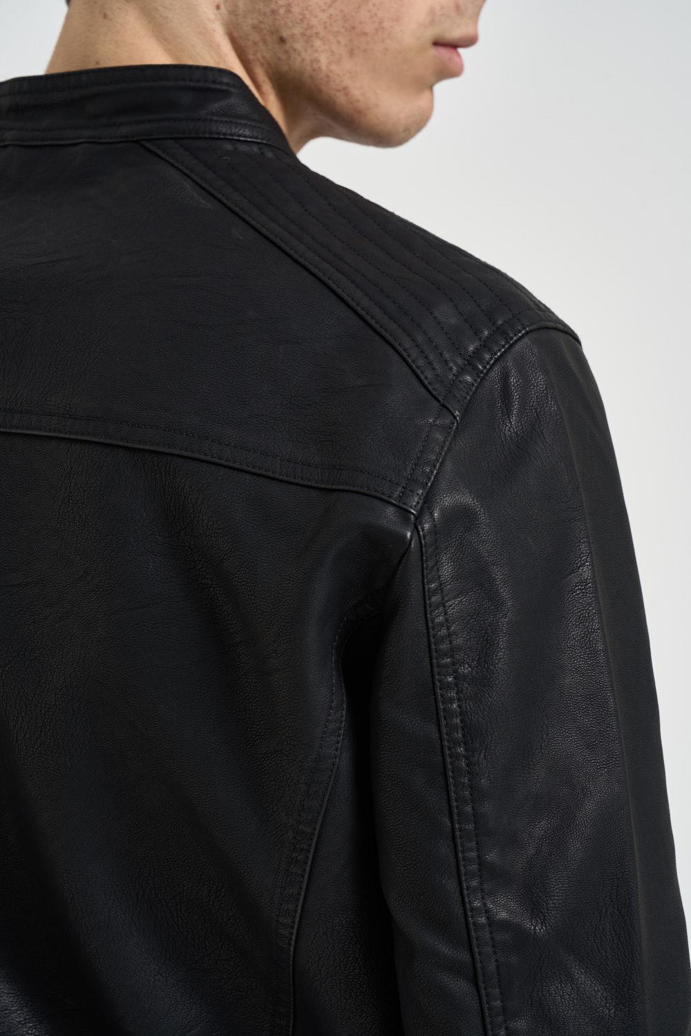 JACK&JONES NOOS Giubbotto uomo ecopelle nero. Modello con collo biker, polsini con zip. Chiusura frontale con zip nascosta, tasche laterali con zip. Dettagli trapuntati. Composizione:100% Poliestere. Il modello è alto 190cm e indossa la tg L.