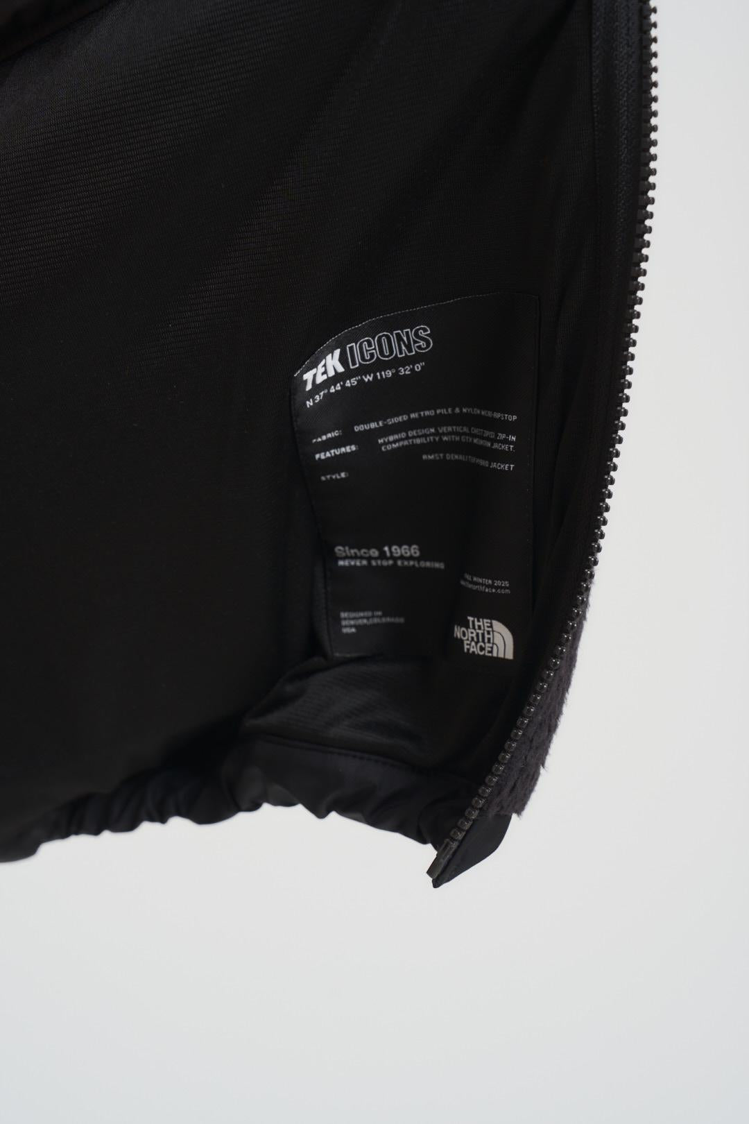 THE NORTH FACE Giubbotto uomo RMST Denali nero. Modello ibrido composto da parte trapuntata in piumino e pile. Collo alto, chiusura con cerniera frontale centrale VISLON®, tasche per le mani e tasche sul petto con cerniera di sicurezza. Cerniere ascellari di ventilazione. Polsini elasticizzati e coulisse interna con blocca-cordino sullorlo, logo ricamato sulla parte sinistra del petto e dietro la spalla destra. Composizione pile: 100% poliestere. Composizione piumino: 100% nylon. Imbottitura: 80% piumino 20% piuma. Il modello è alto 190cm e indossa la taglia L.