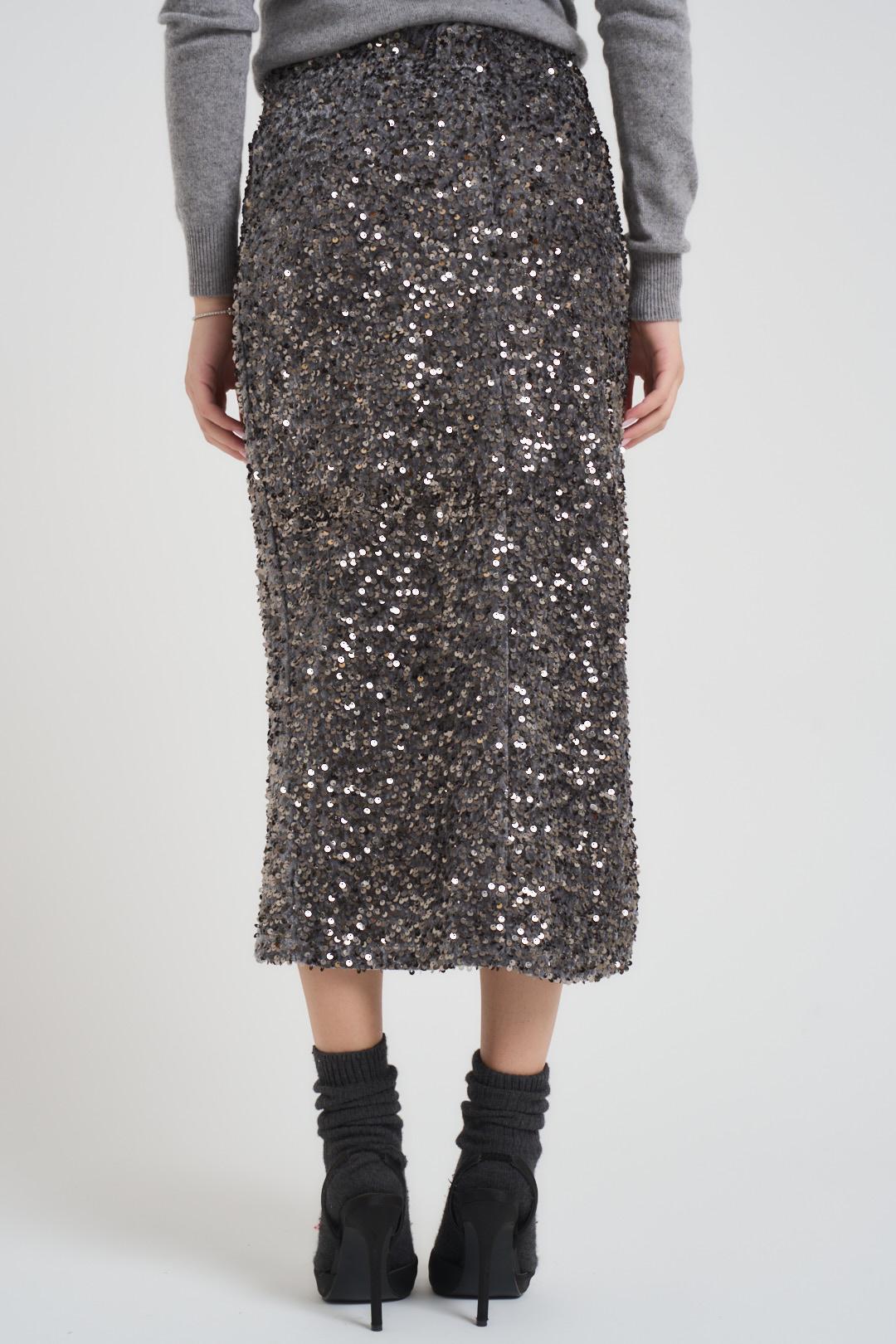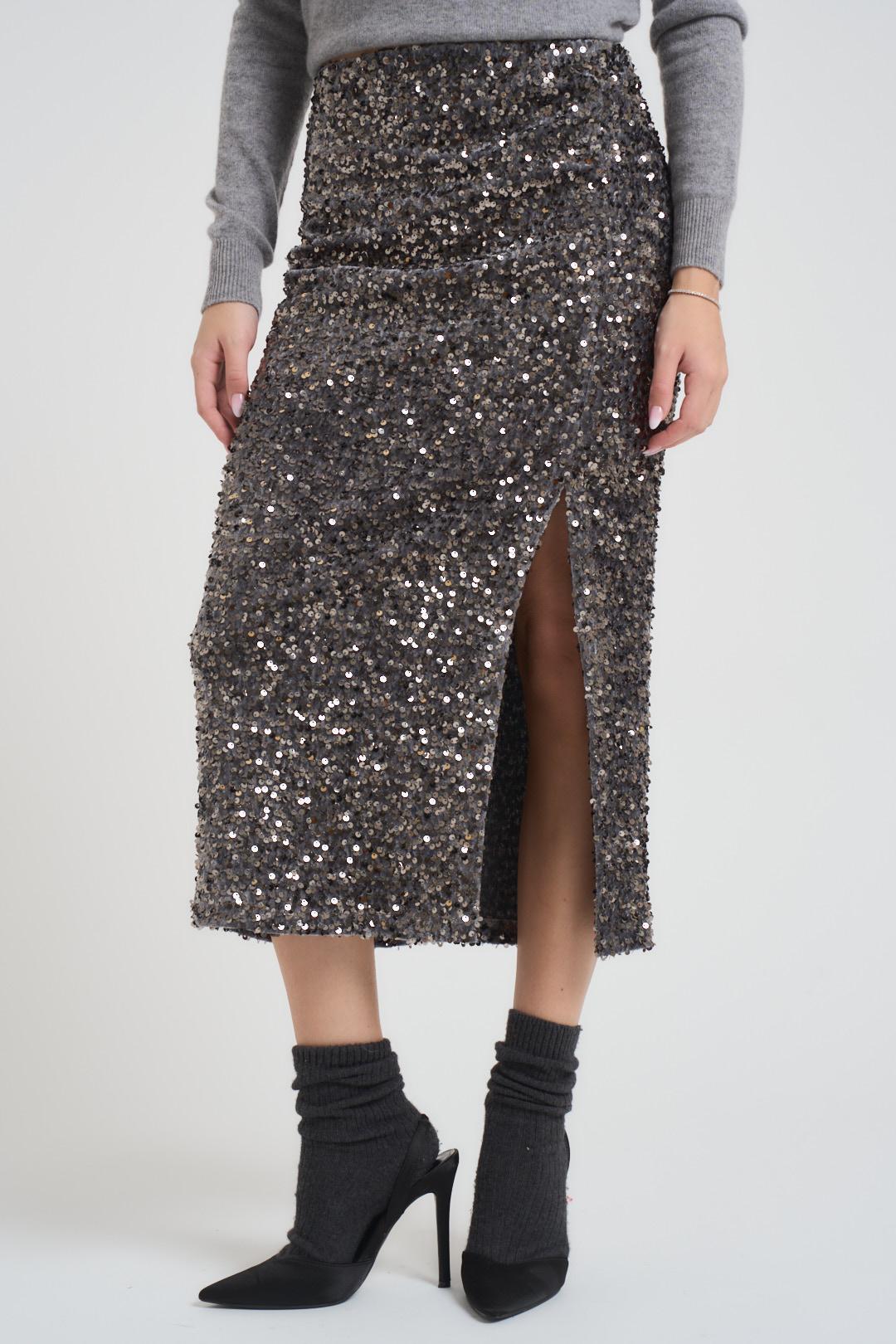 MOTEL Gonna donna con paillettes e spacco grigia. Modello longuette aderente. Composizione: 100% poliestere. La modella è alta 172 cm e indossa la taglia S.