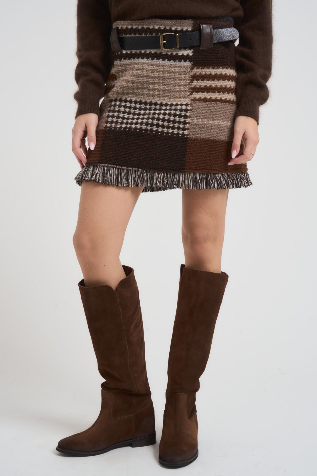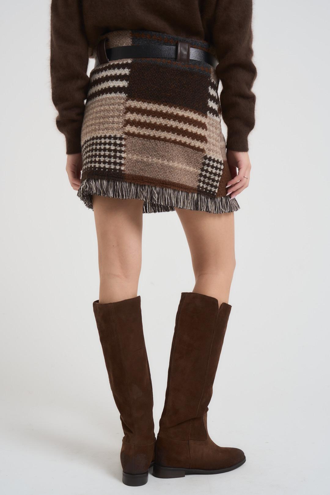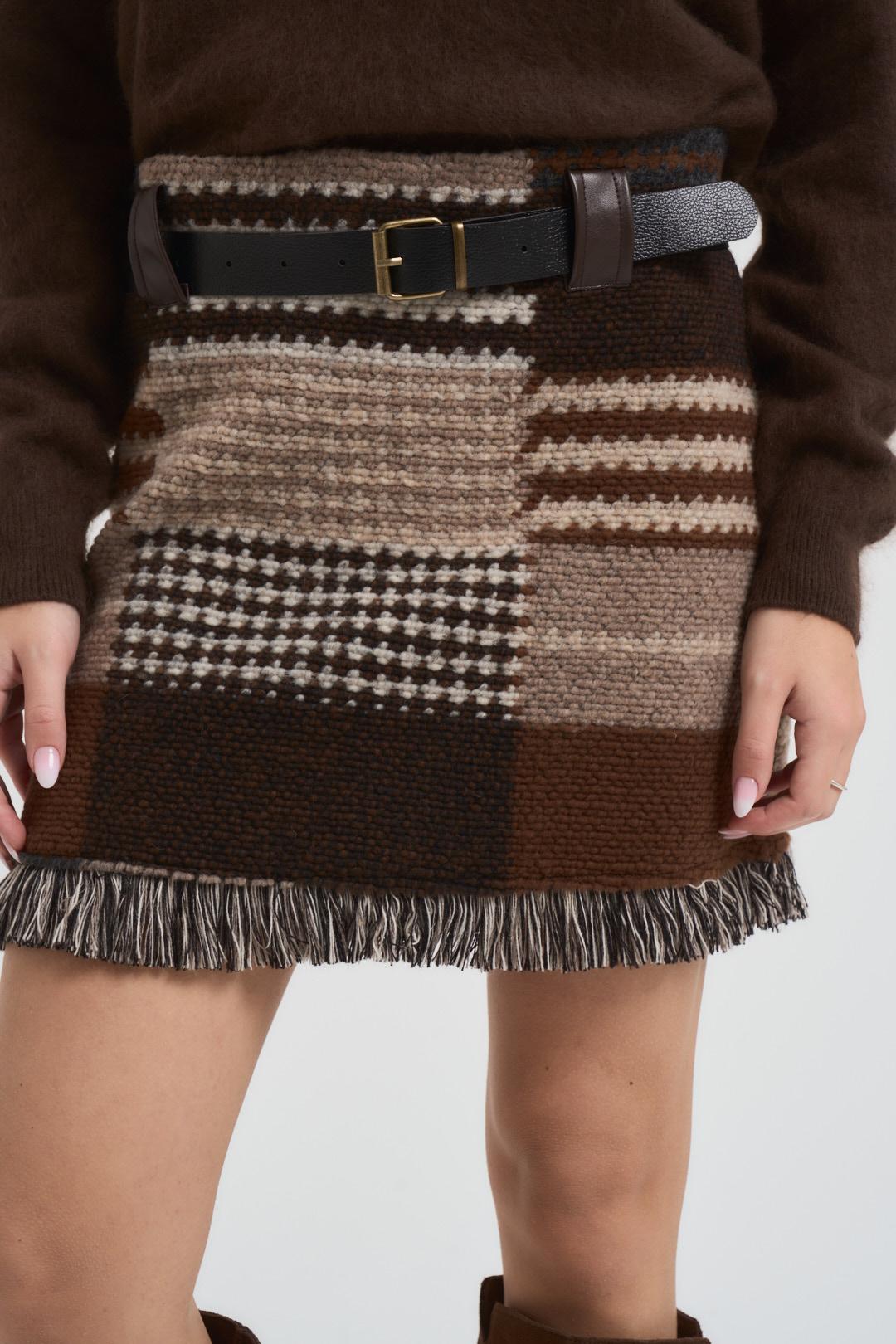 VICOLO Gonna donna in maglia moro. Modello con orlo sfrangiato. Passanti in vita a contrasto e cintura. Composizione: 68% poliestere, 32% lana. La modella è alta 172 cm e indossa la taglia S.