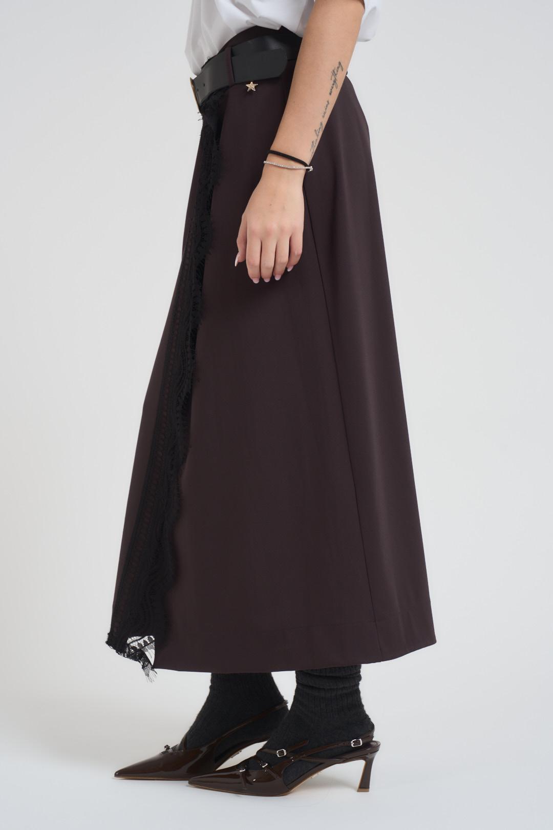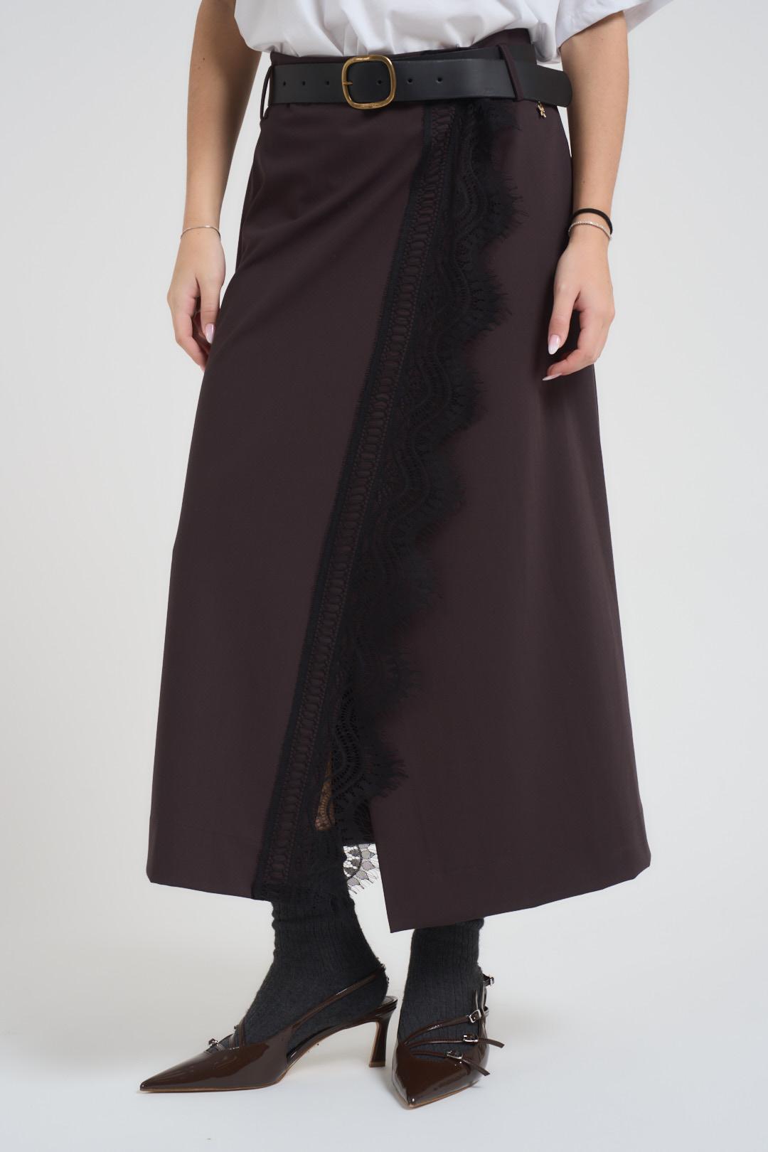 SOUVENIR CLUBBING Gonna donna lunga moro. Modello con spacco e pizzo. Cintura e passanti in vita. Composizione: 62% Poliestere, 25% Viscosa, 8% Lana, 5% Elastane. La modella è alta 172 cm e indossa la taglia S.