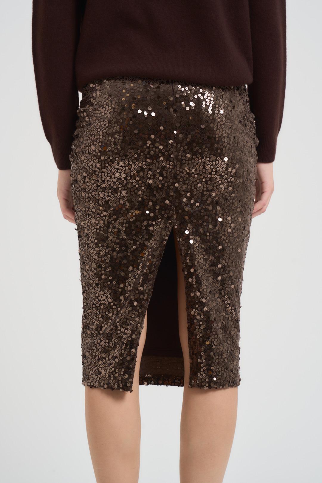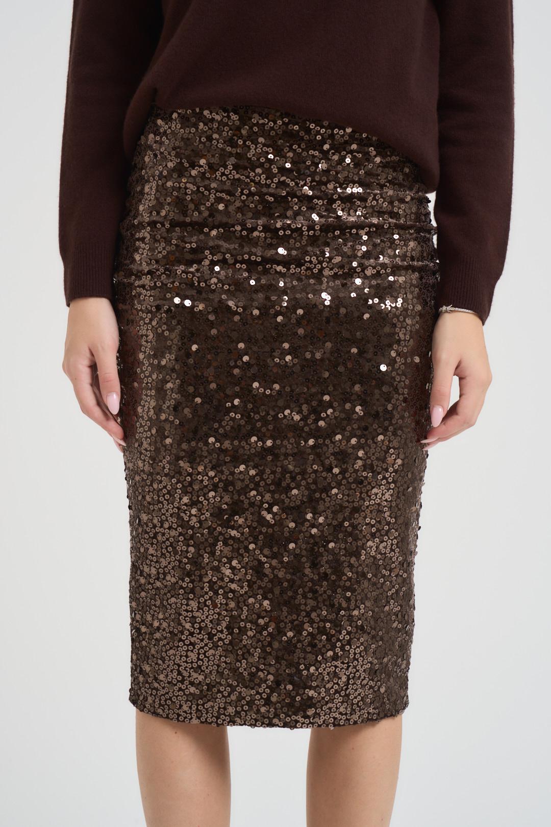 KONTATTO Gonna donna midi con paillettes marrone. Modello con spacco sul retro, slim fit. Composizione: poliestere. La modella è alta 172cm e indossa la taglia S.