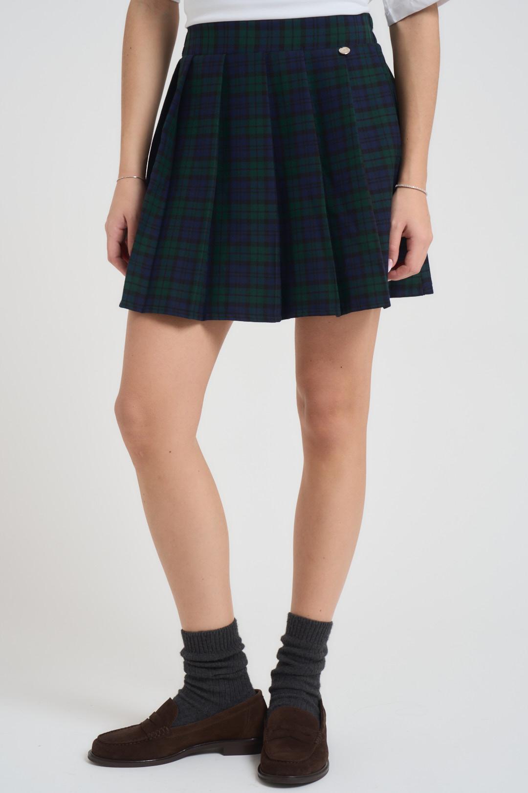 INCLOTH Gonna donna plissettata tartan blu. Colori: rosso e verde. Vita elasticizzata. Composizione: 63% poliestere 34% viscosa 3% elastane. La modella è alta 172cm e indossa la taglia unica.