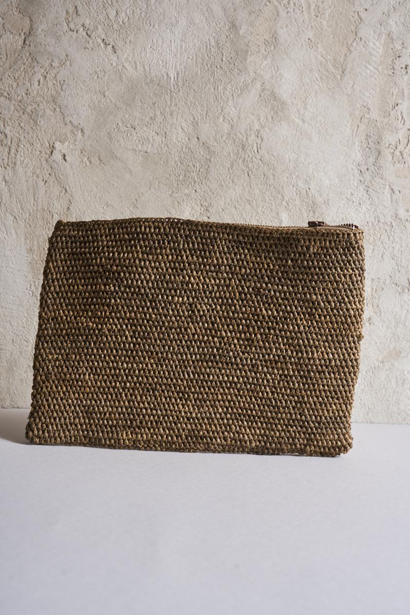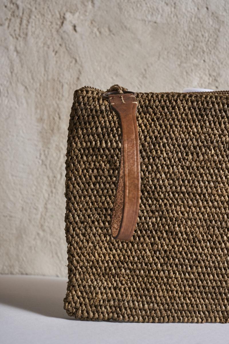 IBELIV Pochette donna Ampy in rafia. Assicurato da una chiusura a zip, AMPY si fissa al polso e lascia le mani libere grazie al cinturino in pelle splendidamente rifinito con cuciture saddle. 100% in Raphia.30 cm di lunghezza x 22 cm di altezza
