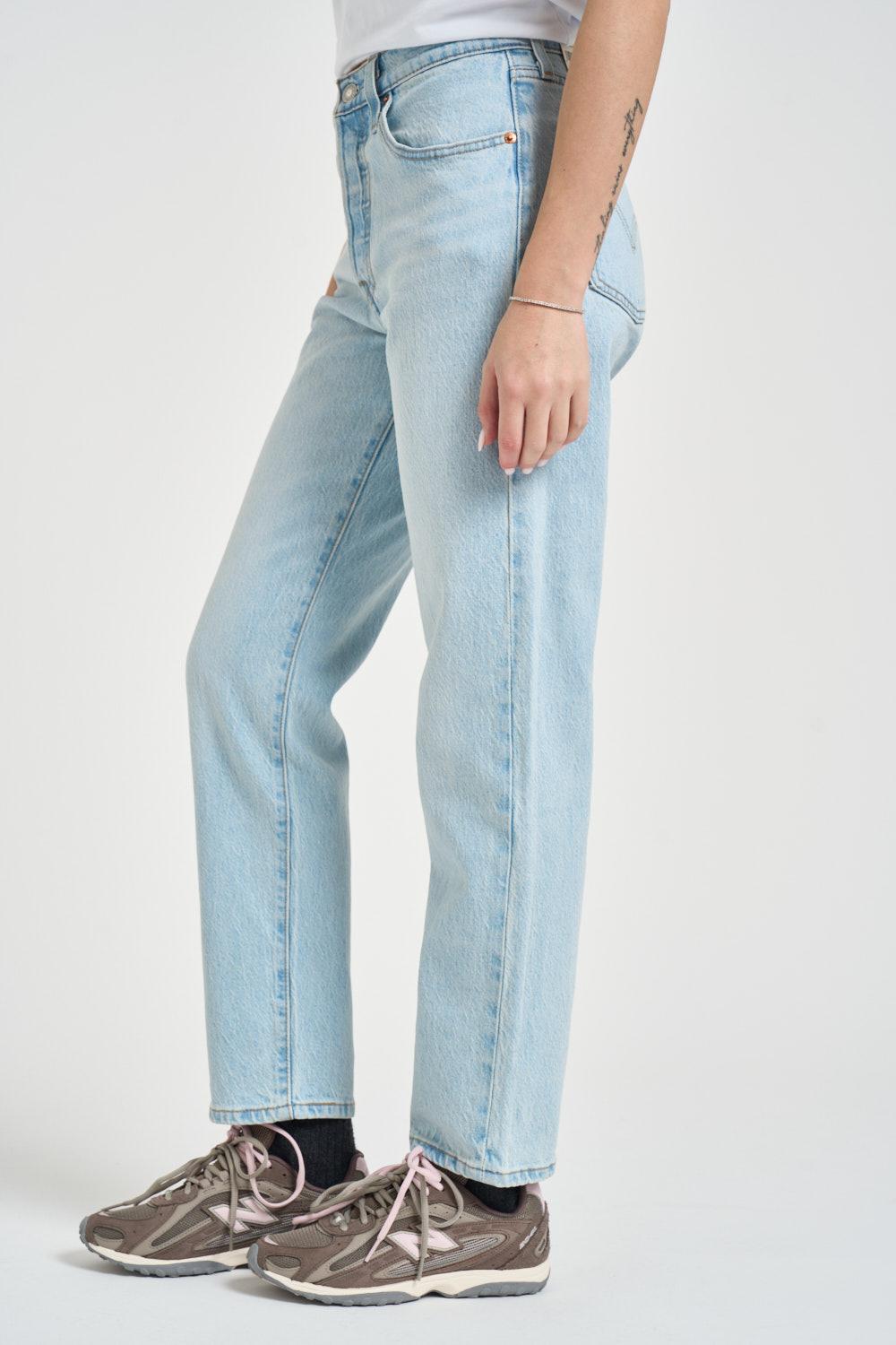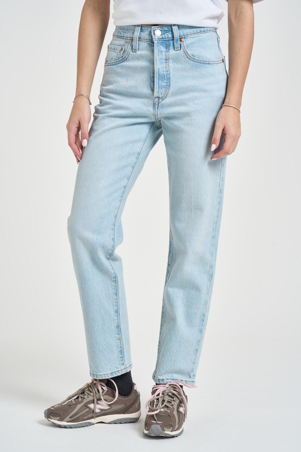 LEVI'S Jeans donna 501 cropped in denim blu chiaro. Modello con classico taglio dritto, design a 5 tasche e patta con bottoni. Composizione: 99% cotone, 1% lycra®. La modella è alta 172cm e indossa la taglia 25.