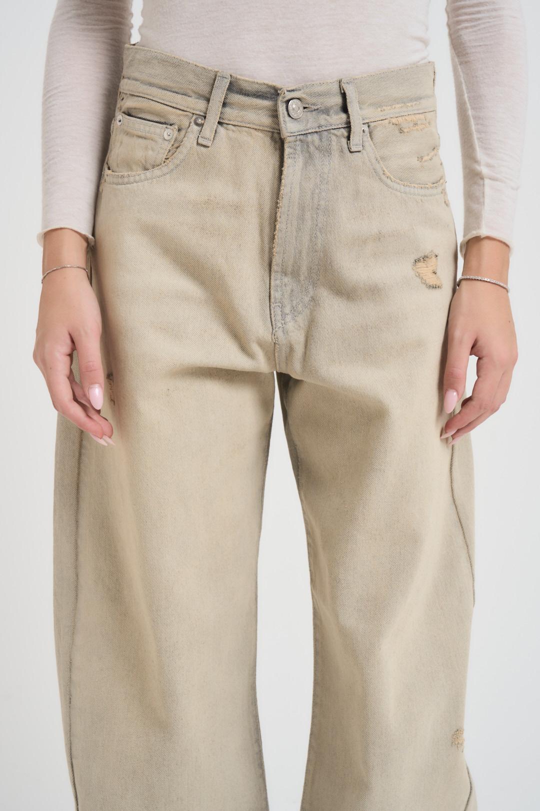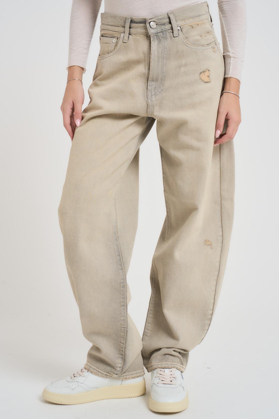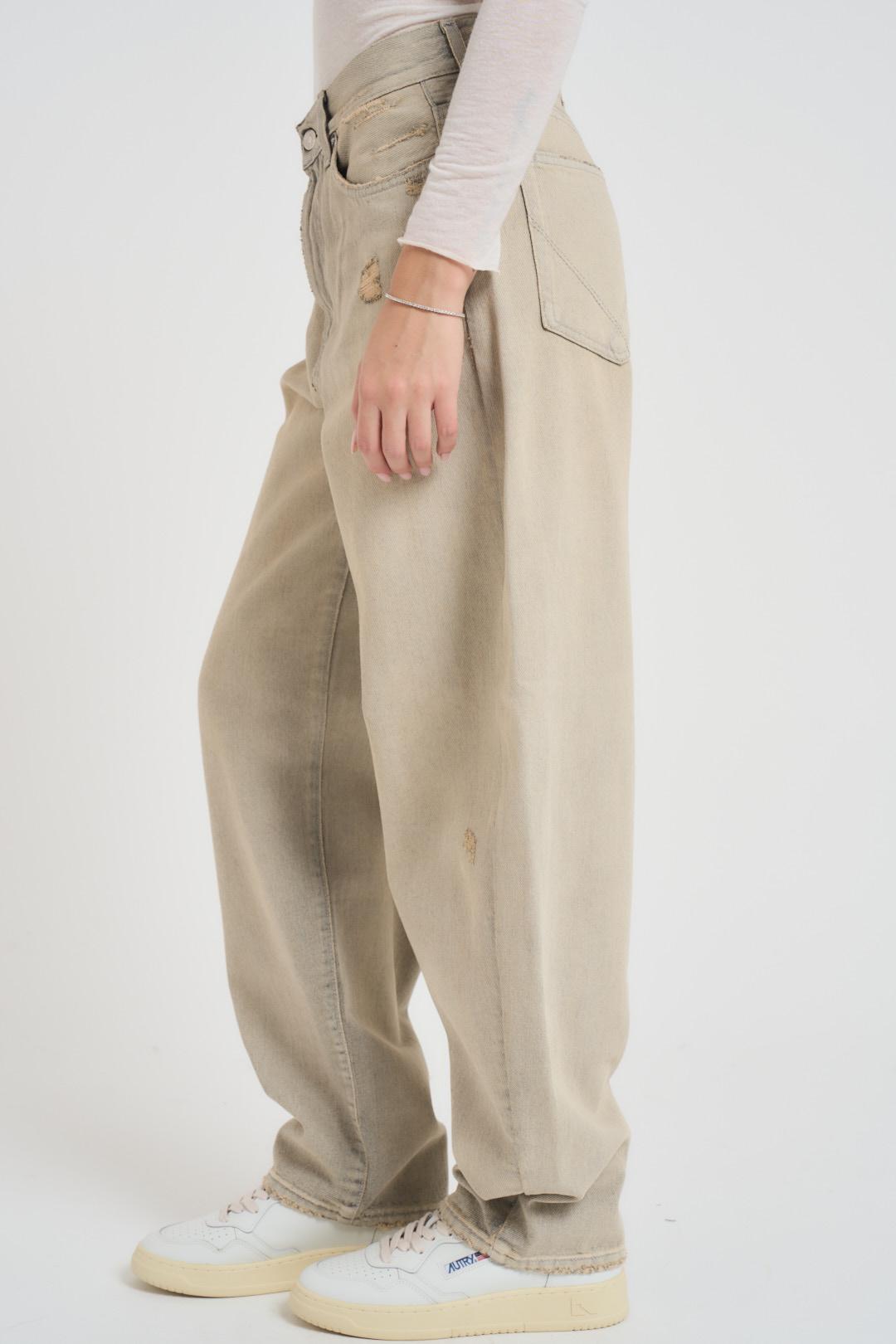 ROY ROGER'S Jeans donna balloon slavato beige. Modello a 5 tasche con rotture gamba larga, chiusura con bottone e zip nascosta. Composizione: 100% cotone. La modella è alta 172cm e indossa la taglia 26.