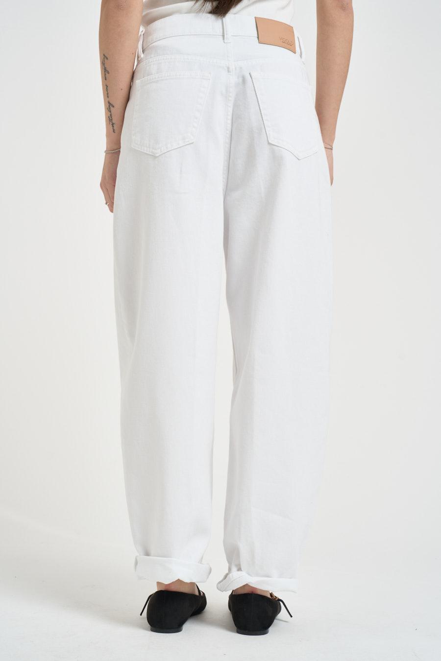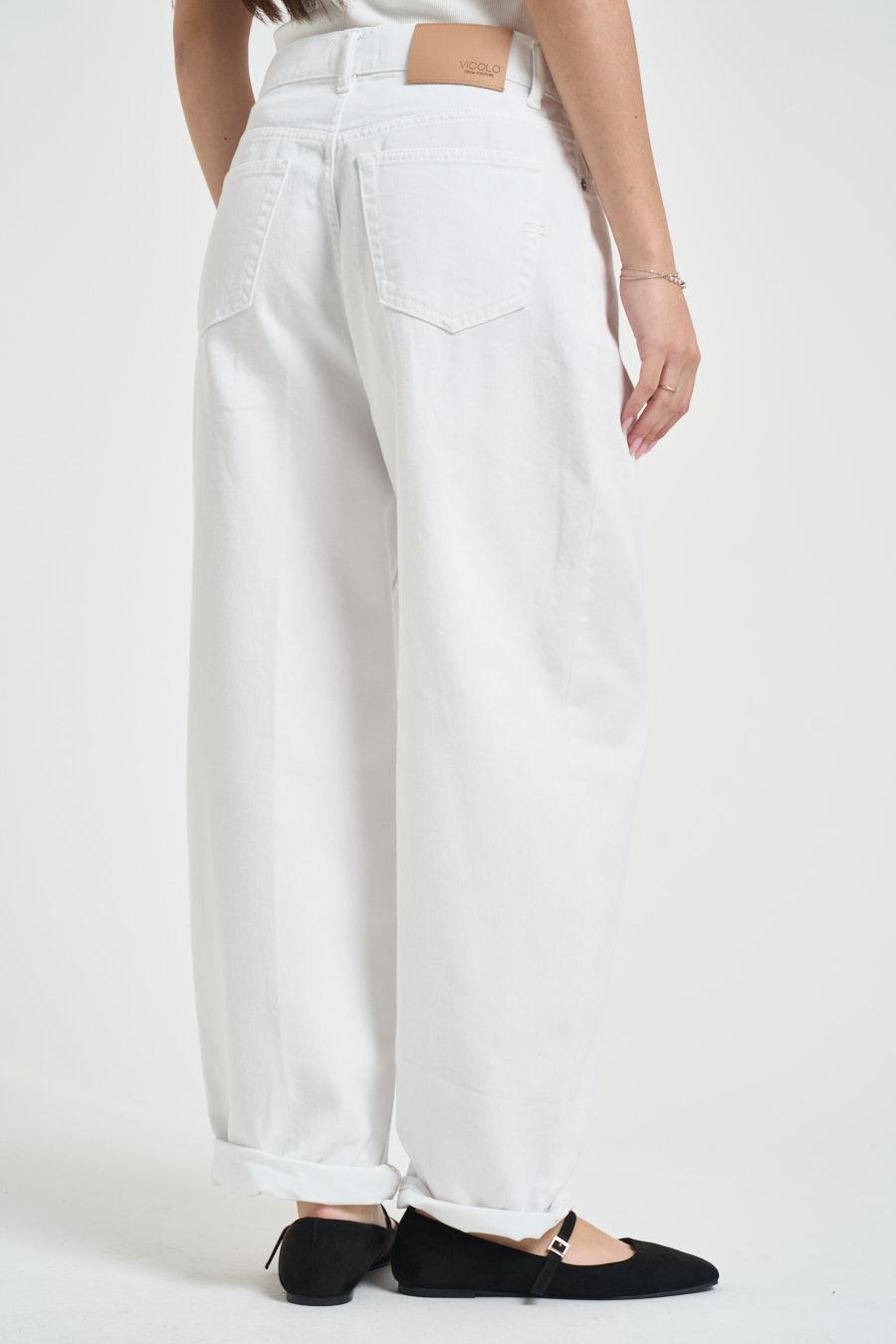 VICOLO Jeans donna Laila in denim bianco. Modello balloon a cinque tasche, chisura con zip e bottone. Vita alta, gamba larga. Composizione: 100% cotone. La modella è alta 172cm e indossa la taglia S.