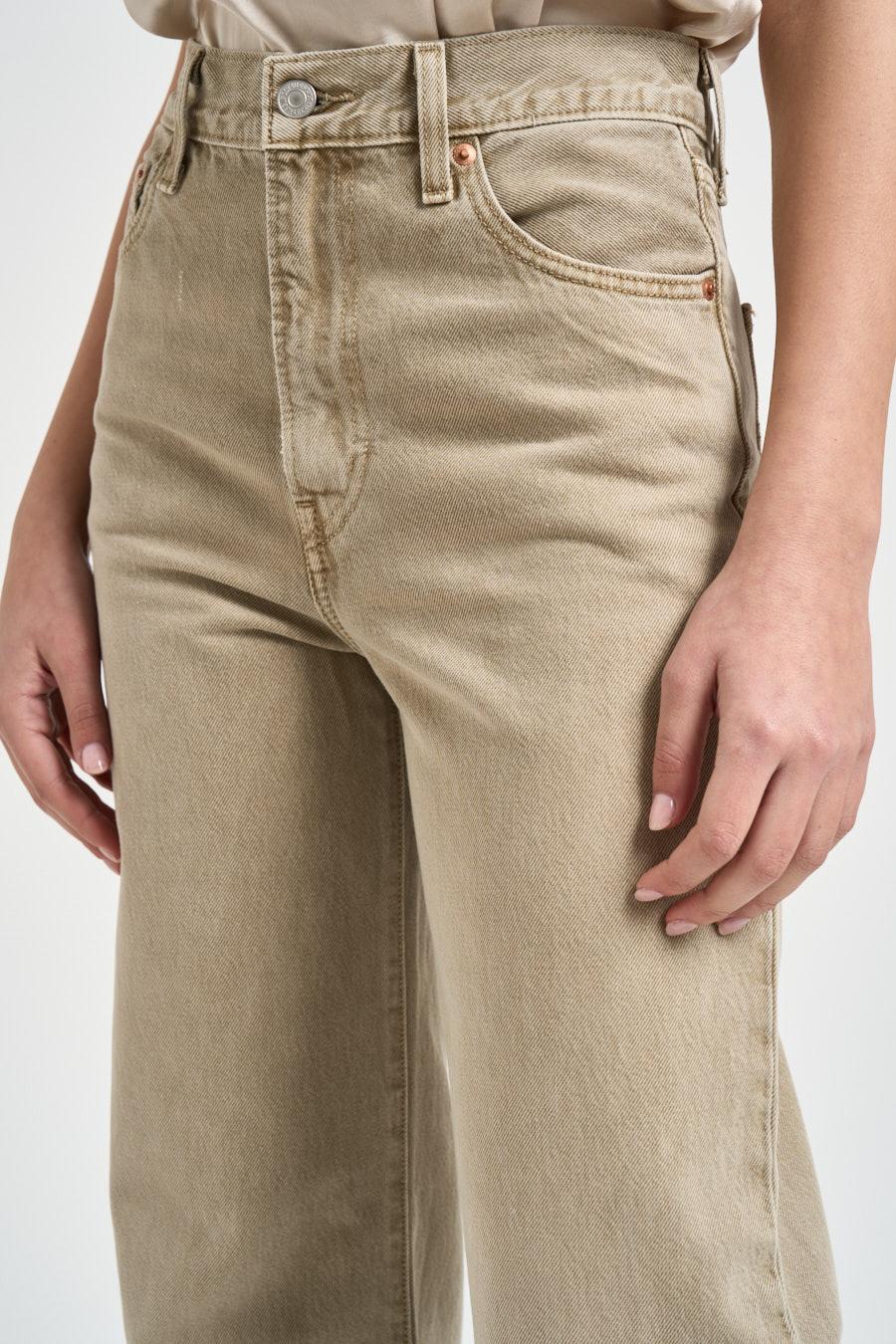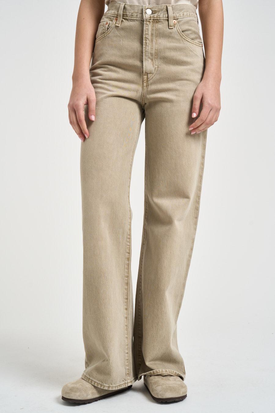 LEVI'S Jeans donna Ribcage in denim beige. Modello a vita alta e taglio dritto. Cinque tasche. Chiusura con bottone e zip. Passanti in vita. Composizione: 100% cotone. La modella è alta 176 cm e indossa la taglia 25.