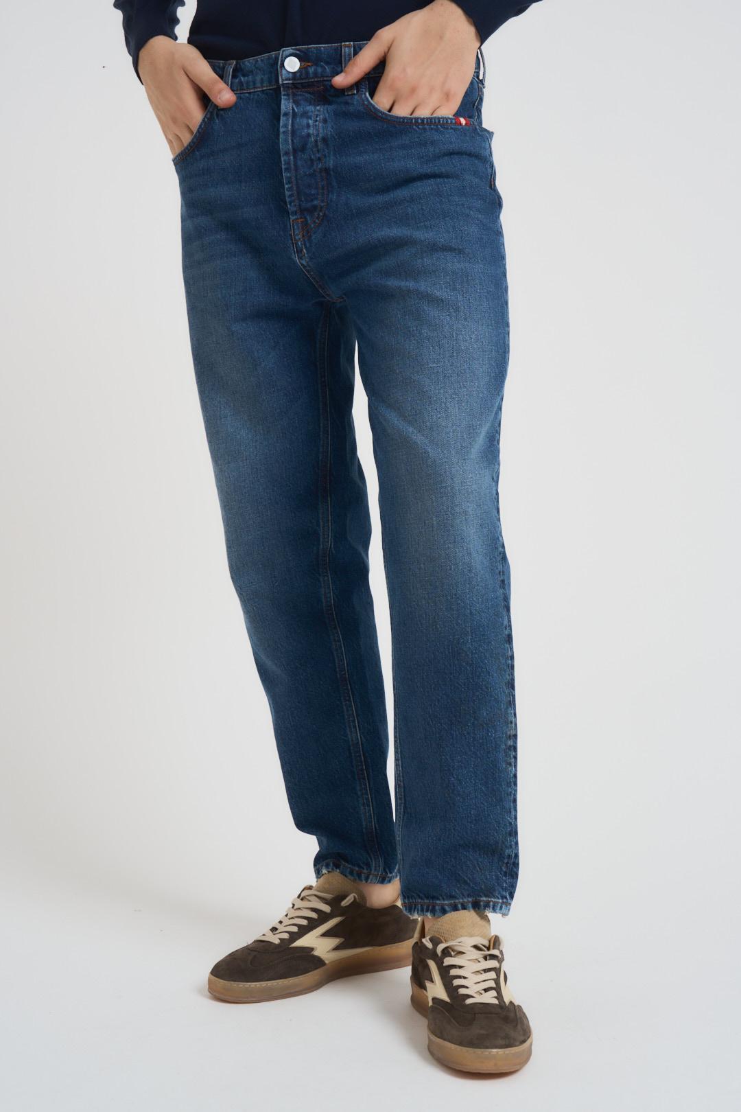 AMISH Jeans uomo blu scuro. Jeans intramontabile, vita media, presenta una chiusura a bottone con zip e tasche laterali. Realizzato in puro cotone. Il modello è alto 190cm e indossa la tg 33.