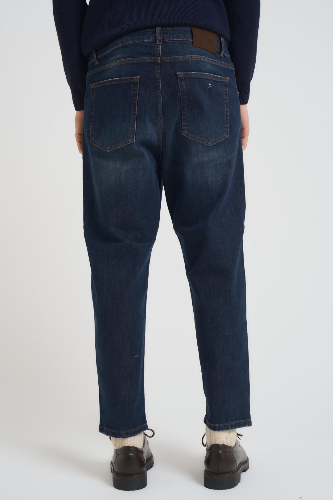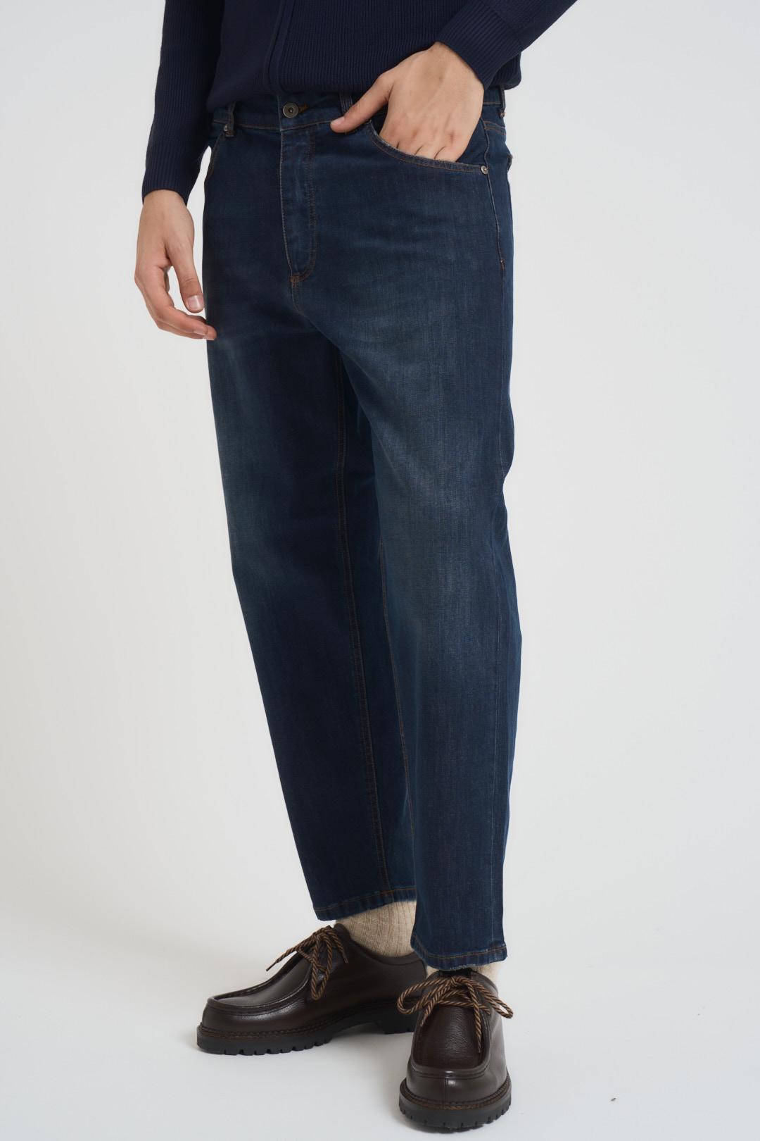 MASSIMO BRUNELLI Jeans uomo chino in denim scuro. Modello a gamba dritta, due tasche laterali a filetto e sul retro. Chiusura con zip e bottone. Composizione: cotone. Il modello è alto 190cm e indossa la taglia 34.