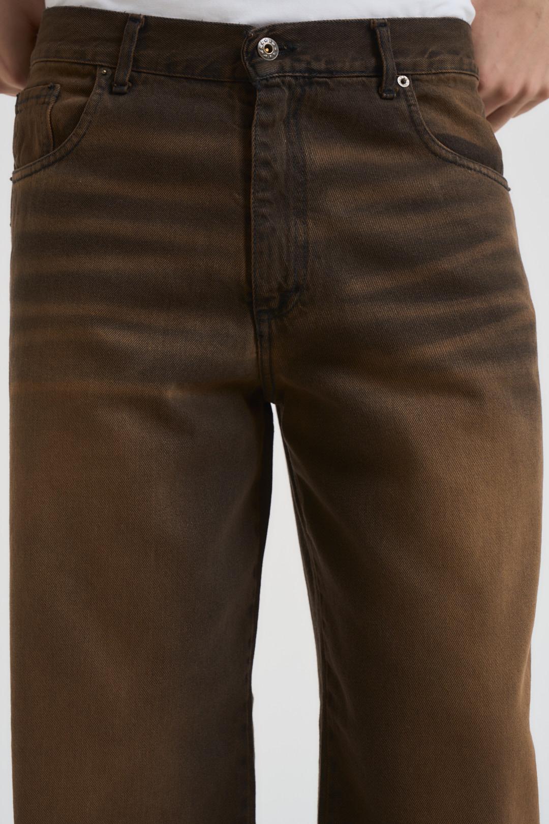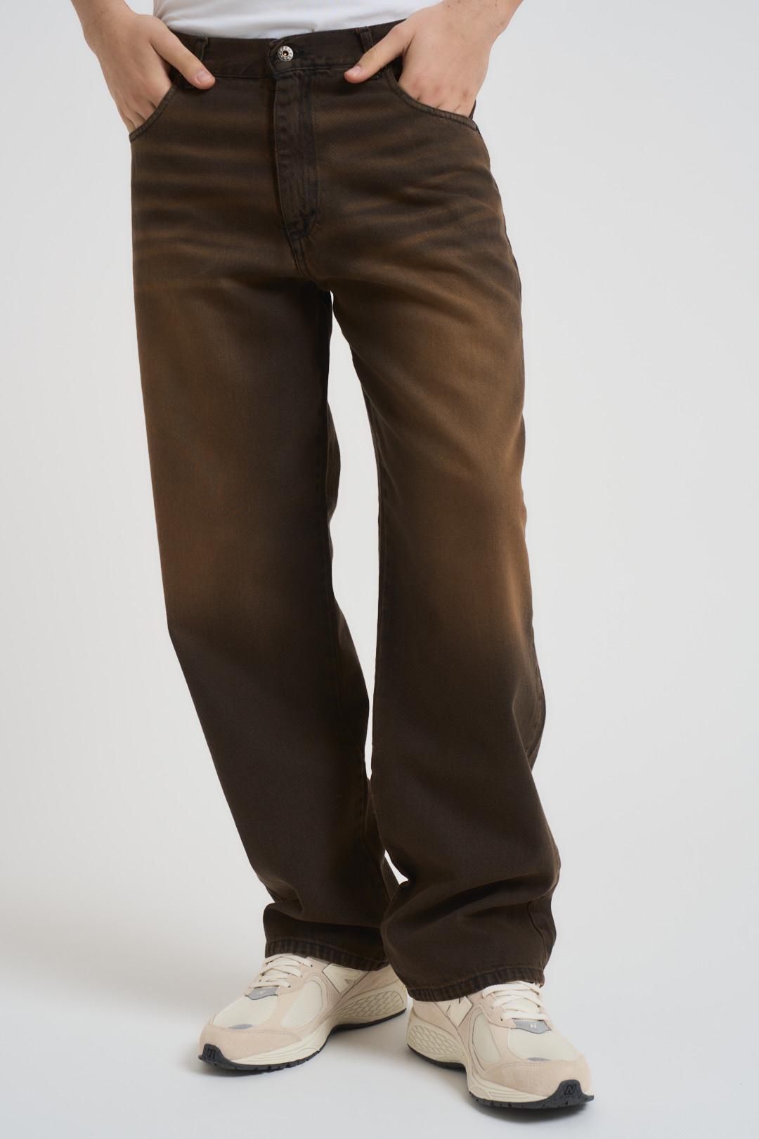 BLACKSUNDAY Jeans uomo in denim slavato marrone. Modello oversize a cinque tasche, chiusura con zip e bottone, gamba dritta. Composizione: 100% cotone. Il modello è alto 190cm e indossa la taglia 48.