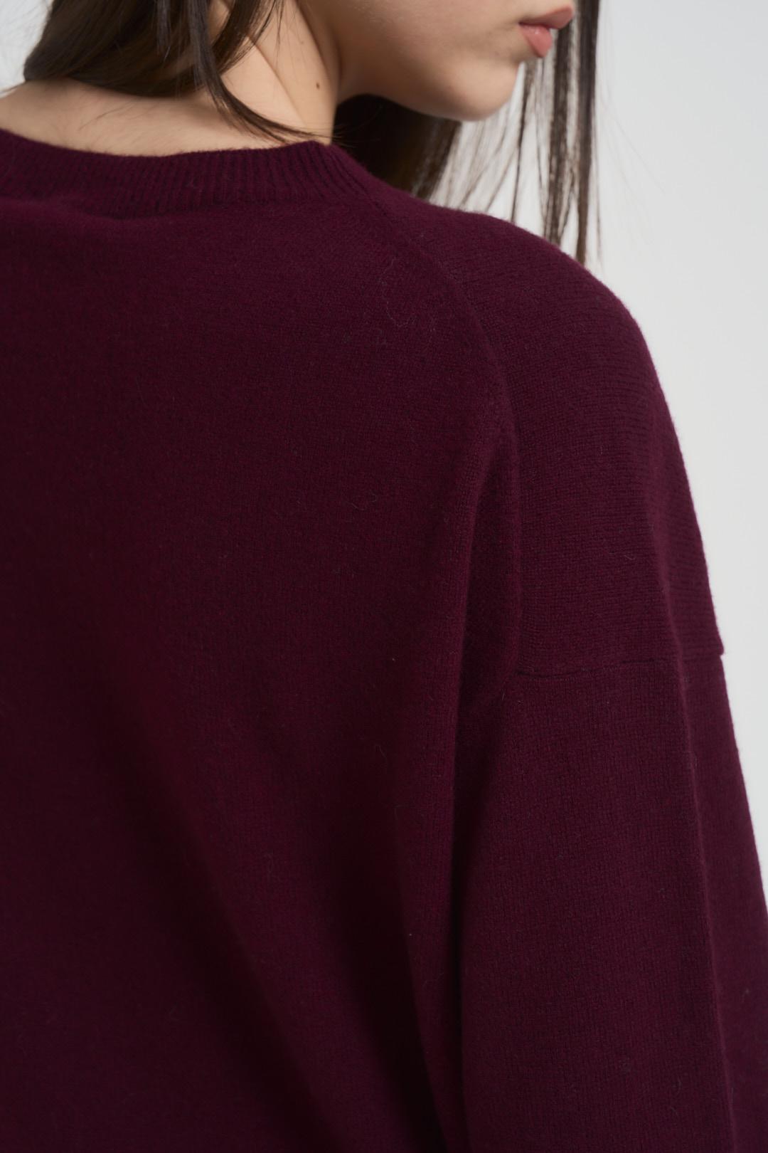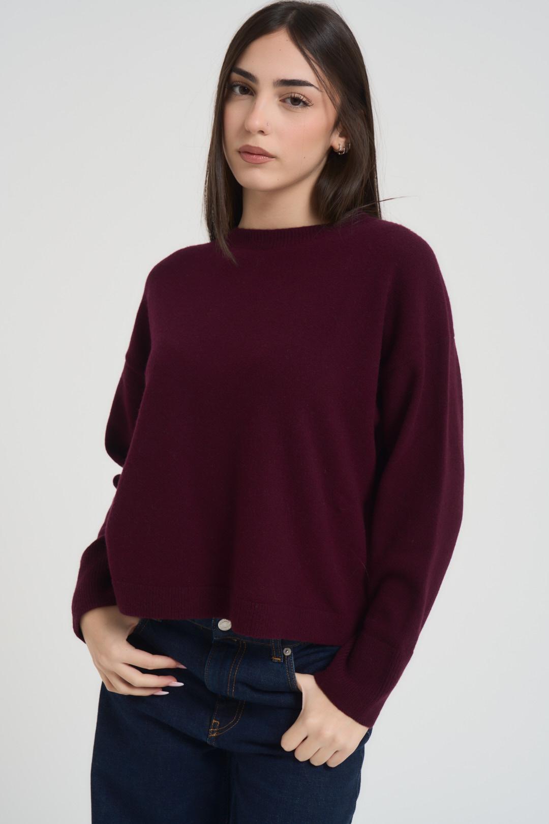 ANGELA DAVIS Maglia donna girocollo bordeaux. Modello a scatolina con dettagli a costine. Composizione: 100% lana. La modella è alta 172 cm e indossa la taglia S.
