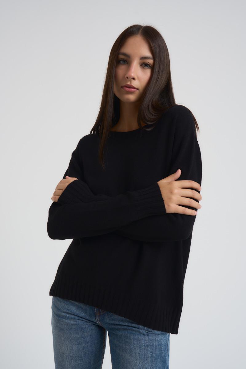 KONTATTO Maglia donna girocollo nera. Modello a manica lunga con dettaglio polsini e fondo a costine. Spacco sul retro. Composizione :63%viscosa 37% nylon. La modella è alta 176 cm e indossa la taglia unica.