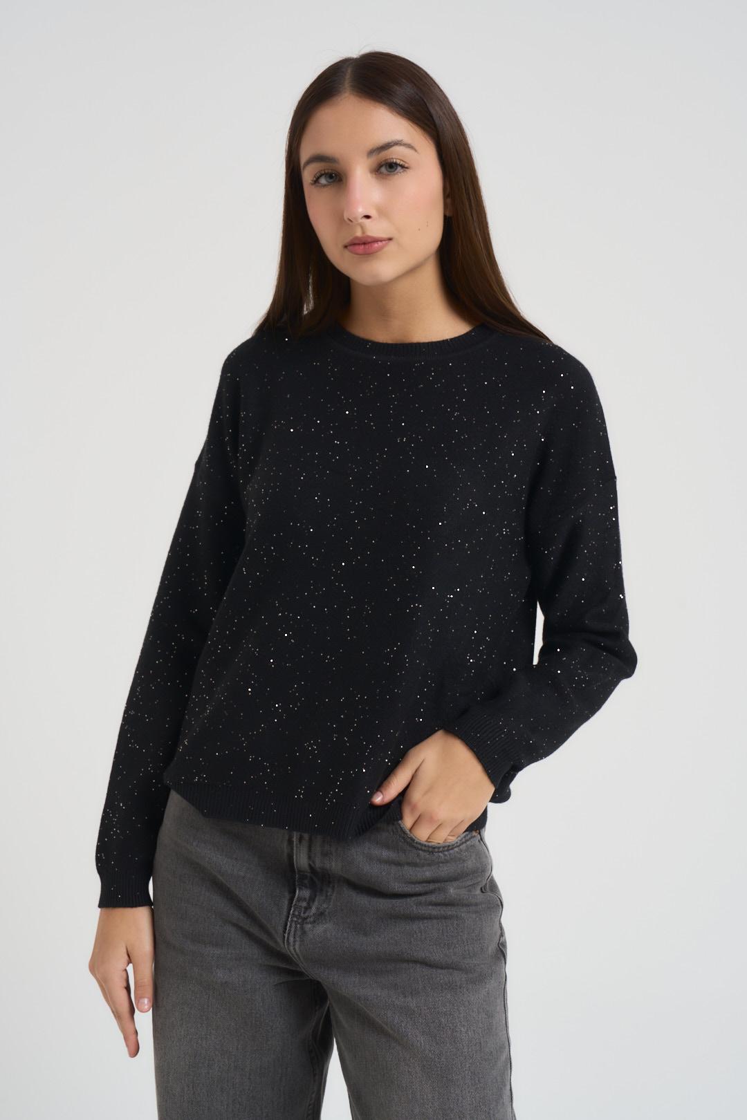 INCLOTH Maglia donna girocollo nera. Modello regular fit. Manica lunga. Collo, fondo manica e orlo a costine. Maglia con punti luce. Composizione: 100% viscosa. La modella è alta 176 cm e indossa la taglia S/M.