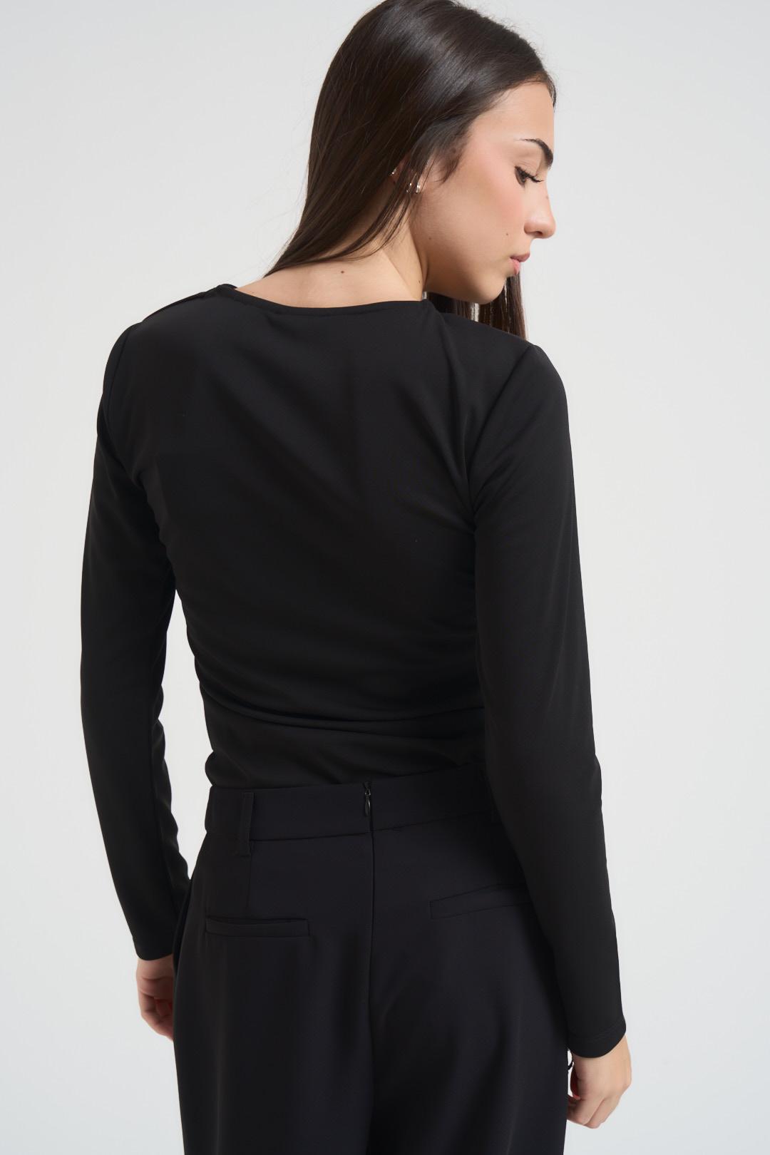 LOKITA MILANO Maglia donna nera con cut out. Modello a manica lunga con scollo sul davanti e cut out. Composizione: viscosa. La modella è alta 172 cm e indossa la taglia unica.