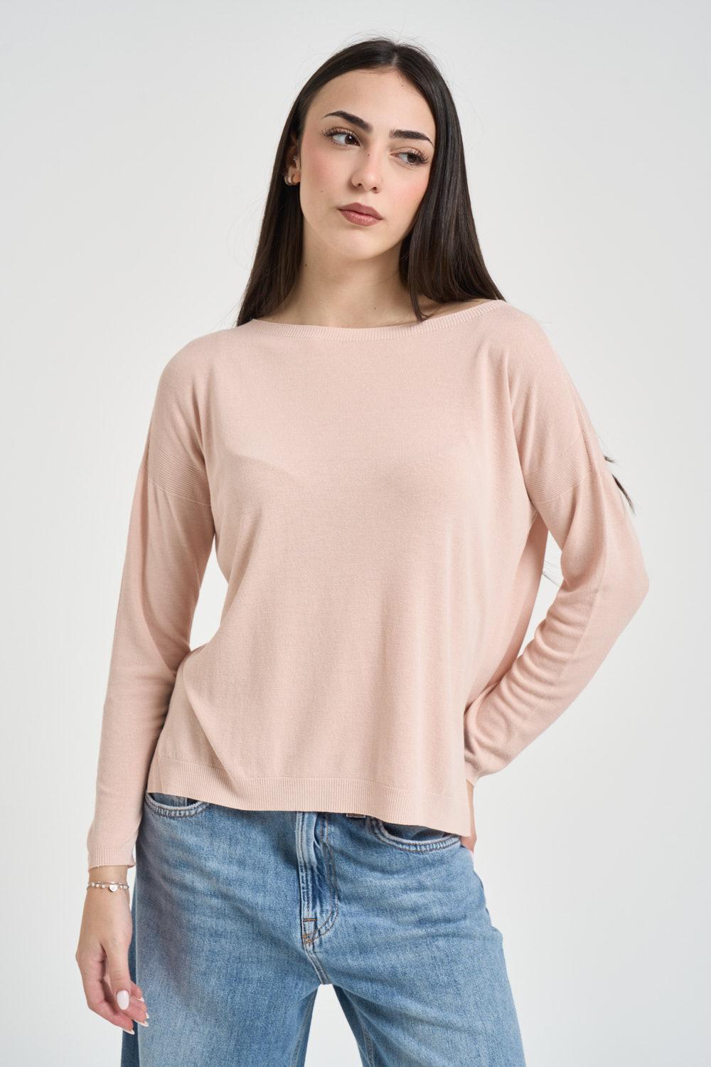 KONTATTO Maglia donna scollo a barca rosa cipria. Modello a maniche lunghe con scollo ampio a barca e vestibilità morbida. Lavorazione a maglia fine con spalle leggermente scese, polsi e fondo rifiniti a costine. Composizione: 87% viscosa 13% poliestere. La modella è alta 172 cm e indossa la taglia unica.
