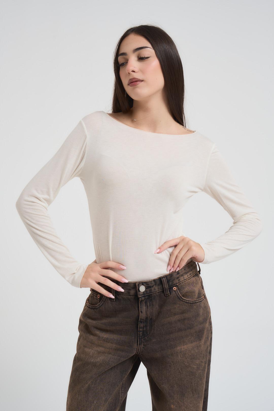 VITTO Maglia donna scollo a barchetta panna. Modello slim fit. Manica lunga. Composizione: 100% viscosa. La modella è alta 172 cm e indossa la taglia UNI.