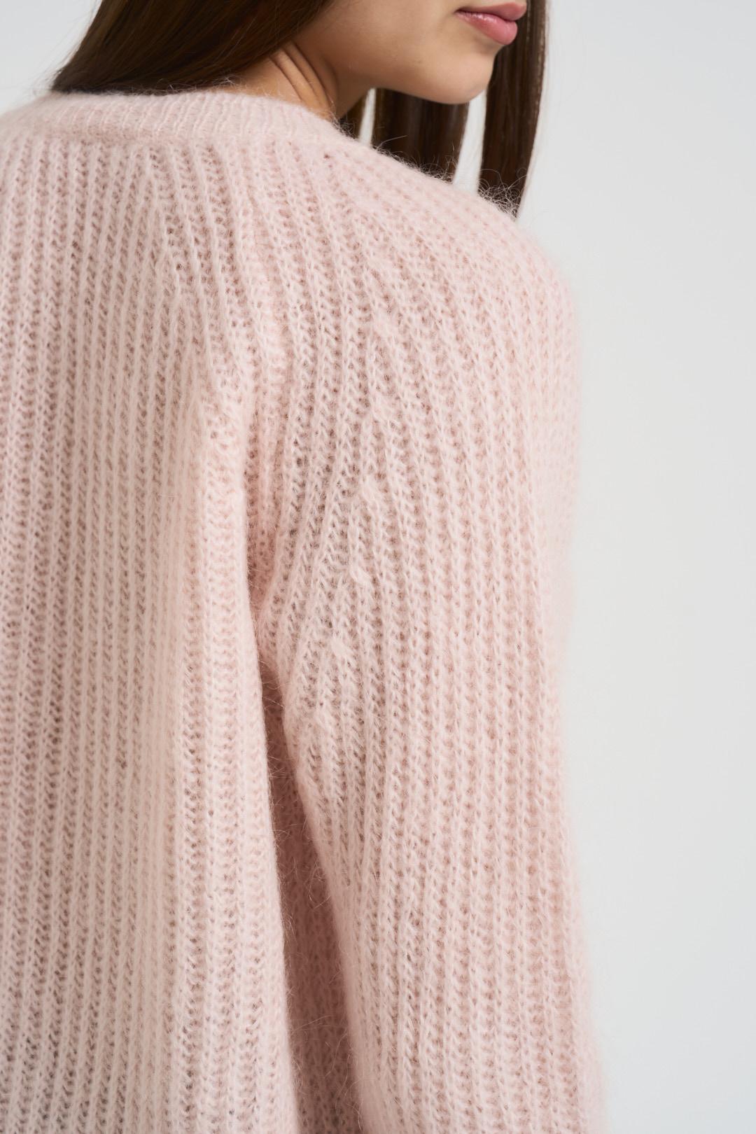 KONTATTO Maglia donna scollo a barchetta rosa pastello. Modello regular fit. Design a costine verticali. Manica lunga. Composizione: 36% Acrilico, 34% Lana, 30% Poliammide. La modella è alta 176 cm e indossa la taglia UNI.