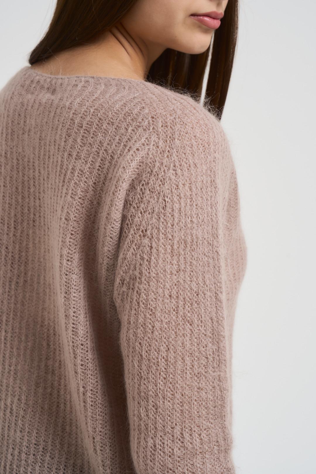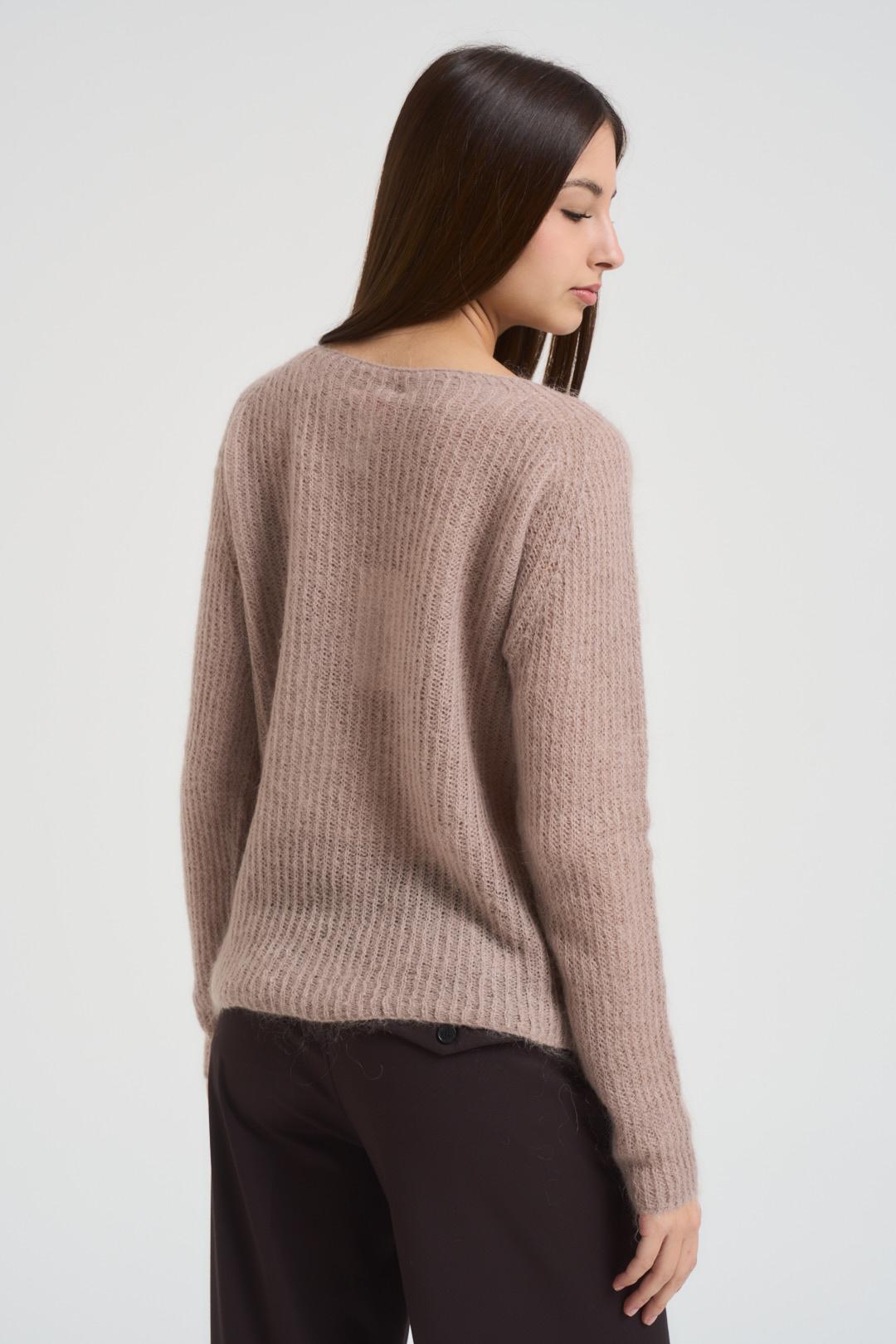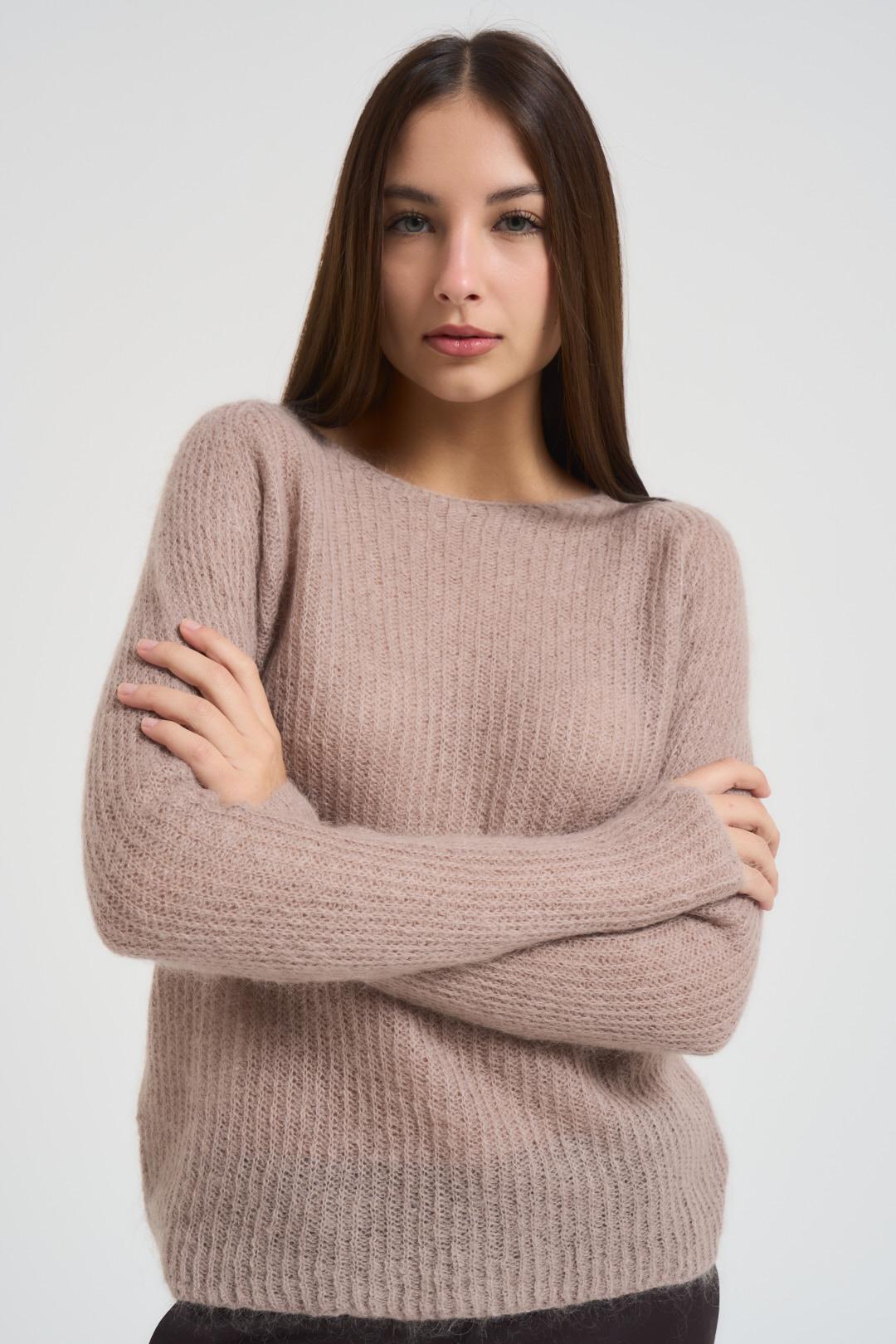 KONTATTO Maglia donna scollo a barchetta tortora. Modello regular fit. Manica lunga. Composizione: 36% Poliestere, 34% Lana, 30% Poliammide. La modella è alta 176 cm e indossa la taglia UNI.