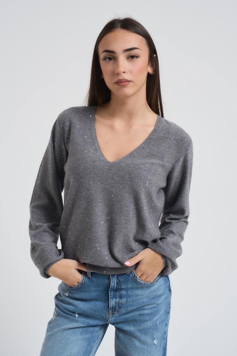 KONTATTO Maglia donna scollo a V grigia. Modello con dettagli luminosi e polsini fndo manica. Composizione: 48% Viscosa 30% Poliestere 22% Poliammide. La modella è alta 172 cm e indossa la taglia S.