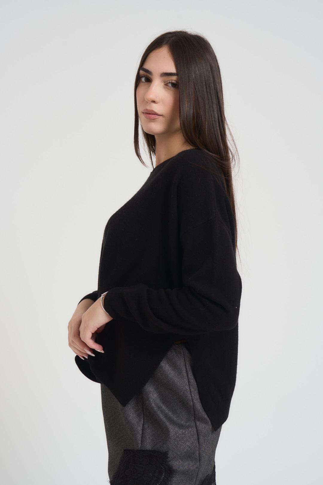 KAOS Maglia over donna scollo a barca nera. Modello con spalla scesa, maniche lunghe, spacchi laterali. Collo, bordi e polsini rifiniti a costine. Composizione: 100% lana. La modella è alta 172 cm e indossa la taglia S.