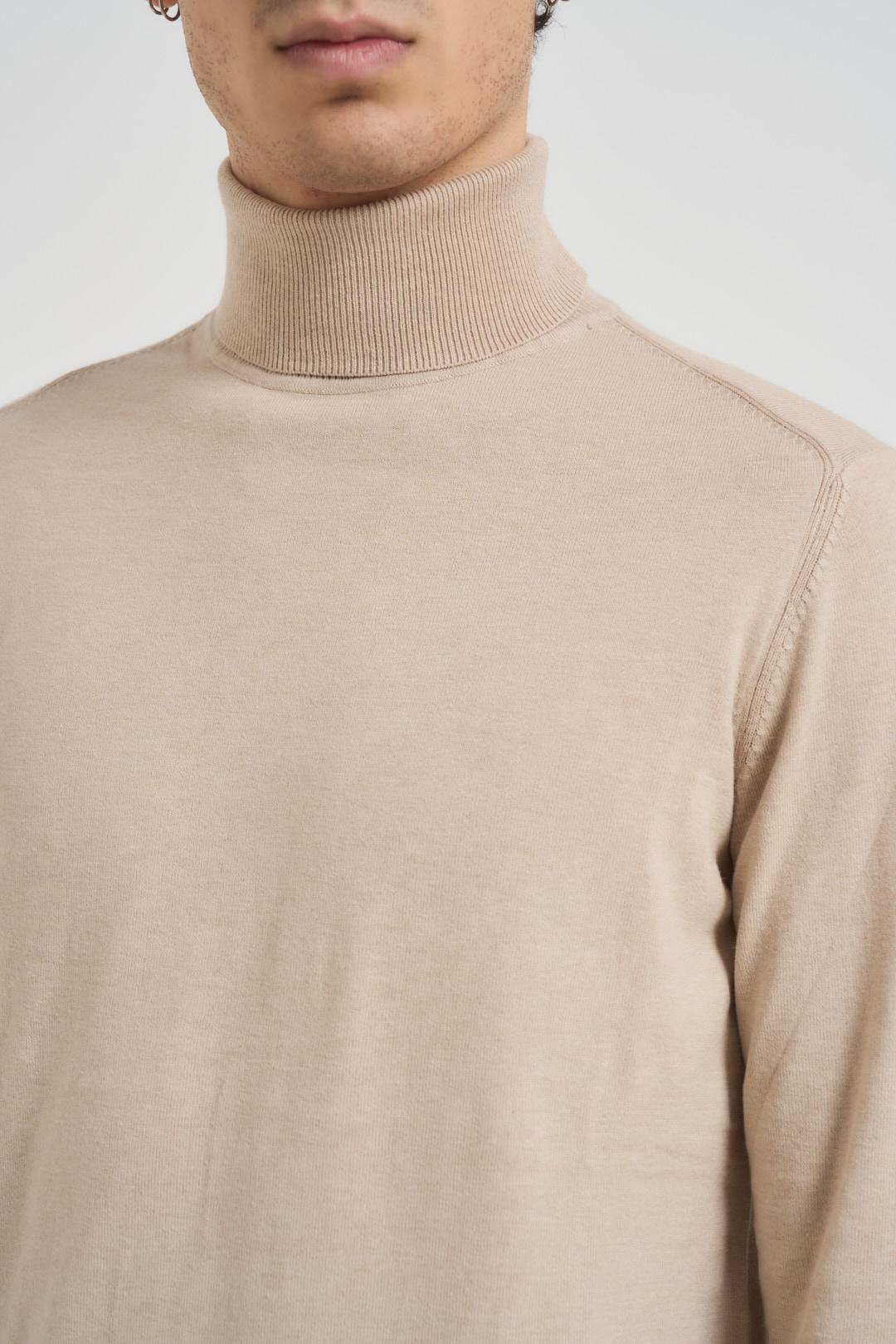 MARKUP Maglia uomo collo alto beige. Modello regular fit. Manica lunga. Collo, polsi e orlo a costine. Composizione: 60% cotone, 30% seta, 10% cashmere. Il modello è alto 190 cm e indossa la taglia L.