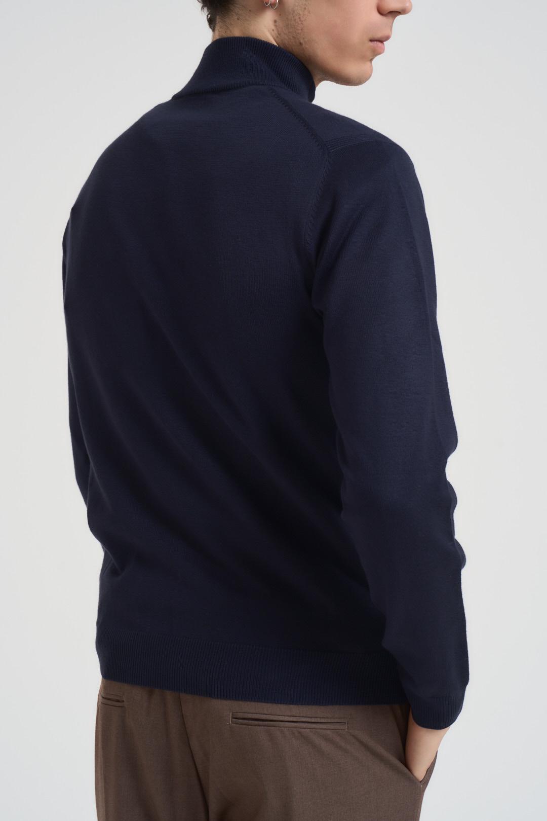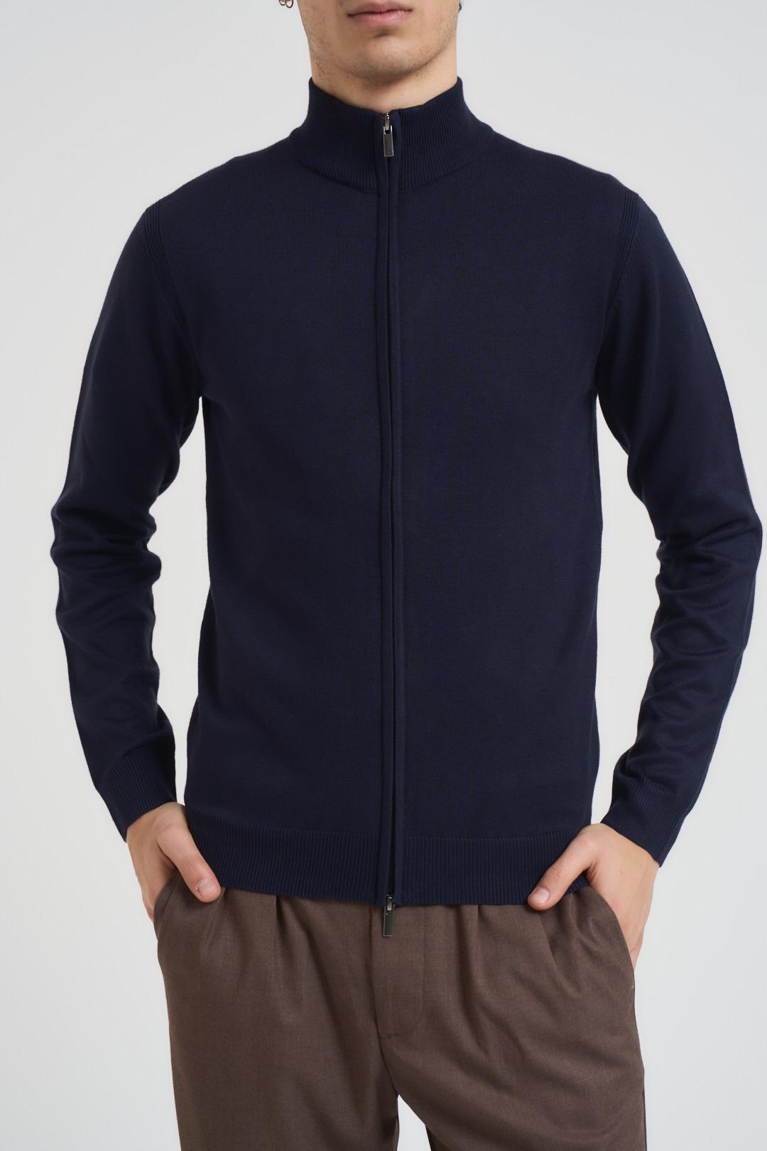HAMAKI-HO MILANO Maglia uomo con zip blu. Modello slim fit. Mezzo collo. Chiusura frontale con zip. Maniche lunghe. Collo, polsi e orlo con lavorazione a costine. Composizione: 70% Viscosa, 30% Nylon. Il modello è alto 190 cm e indossa la taglia L.