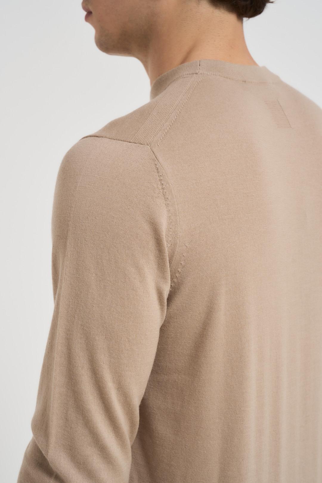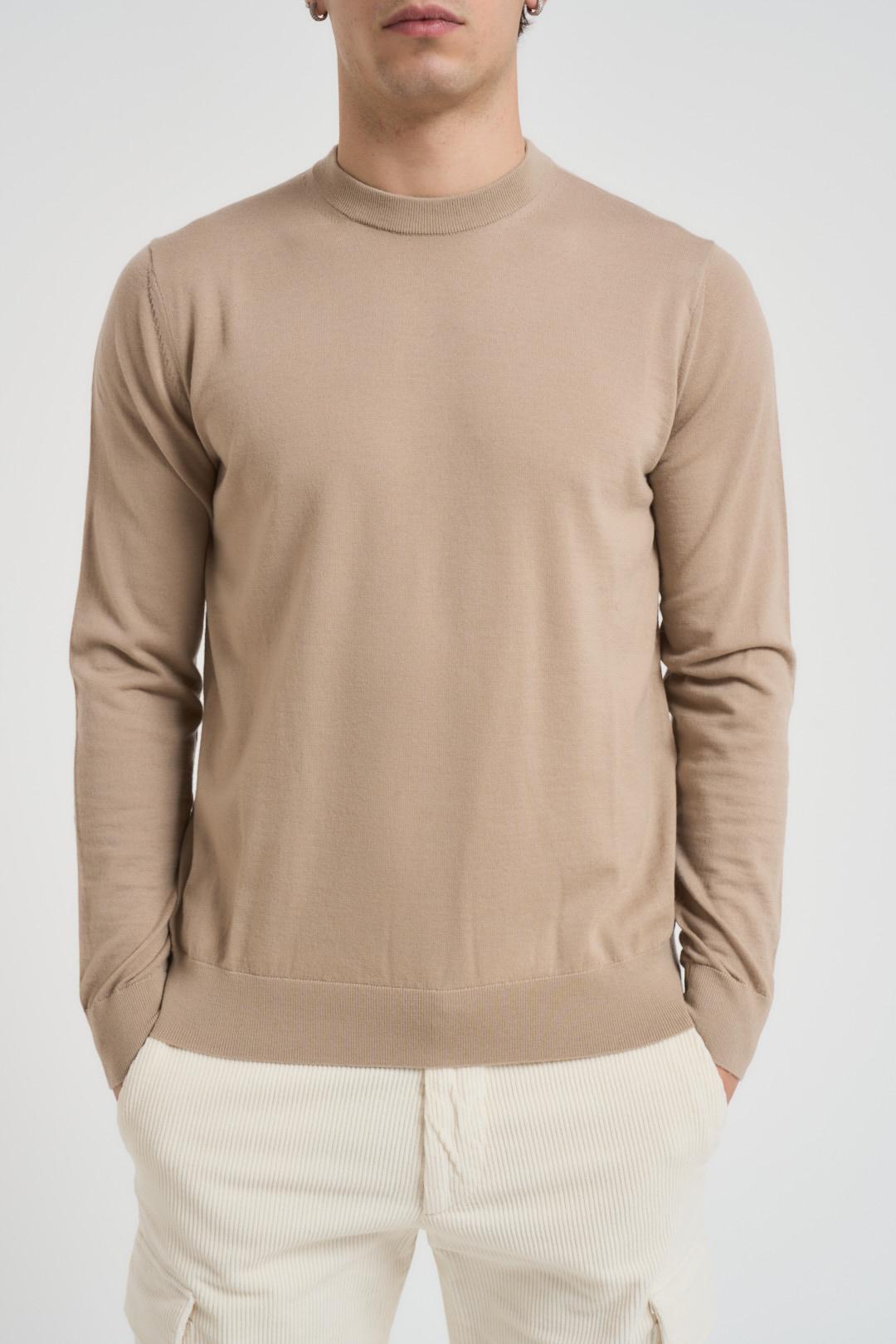 DIKTAT Maglia uomo girocollo beige. Modello con dettagli a costine, regular fit. Composizione: 100% lana merinos. Il modello è alto 190cm e indossa la taglia L.