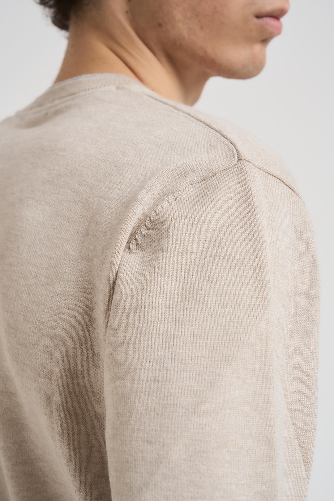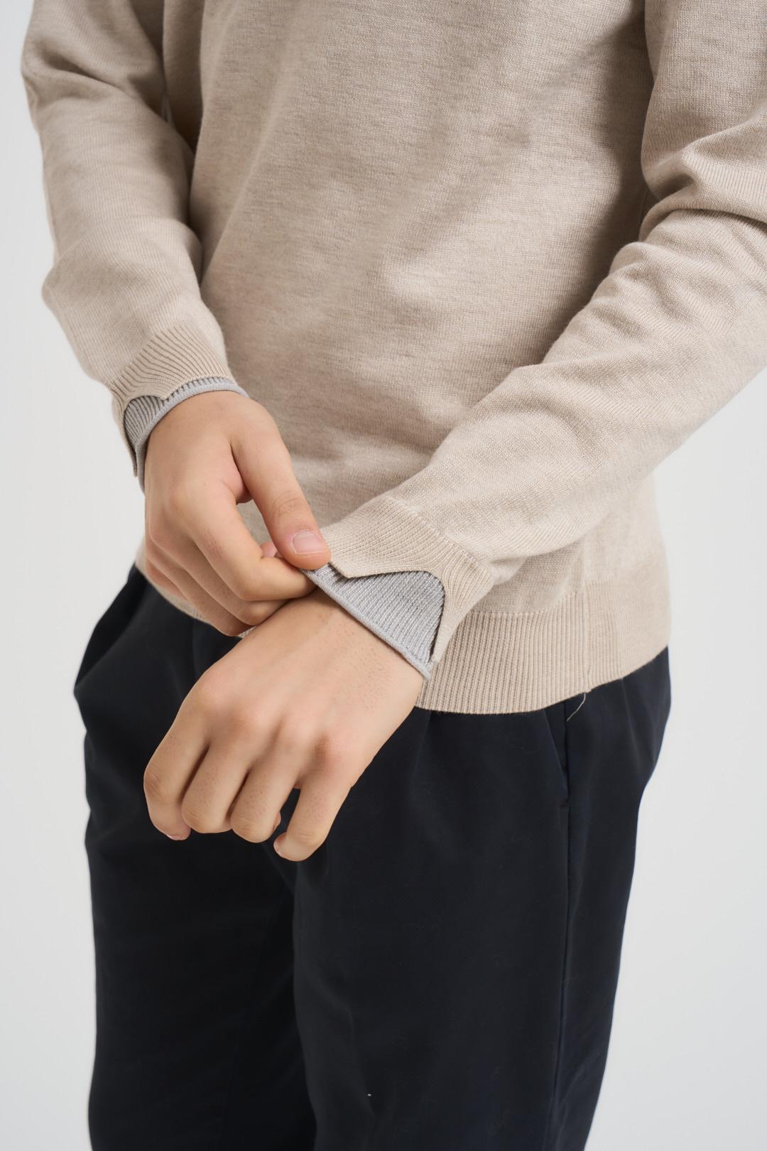 SSEINSE Maglia uomo girocollo beige. Modello a manica lunga con dettagli a costine, regular fit. Doppio polsino/collo grigio chiaro con apertura. Composizione: 70% Viscosa 30% Nylon. Il modello è alto 190cm e indossa la taglia L.