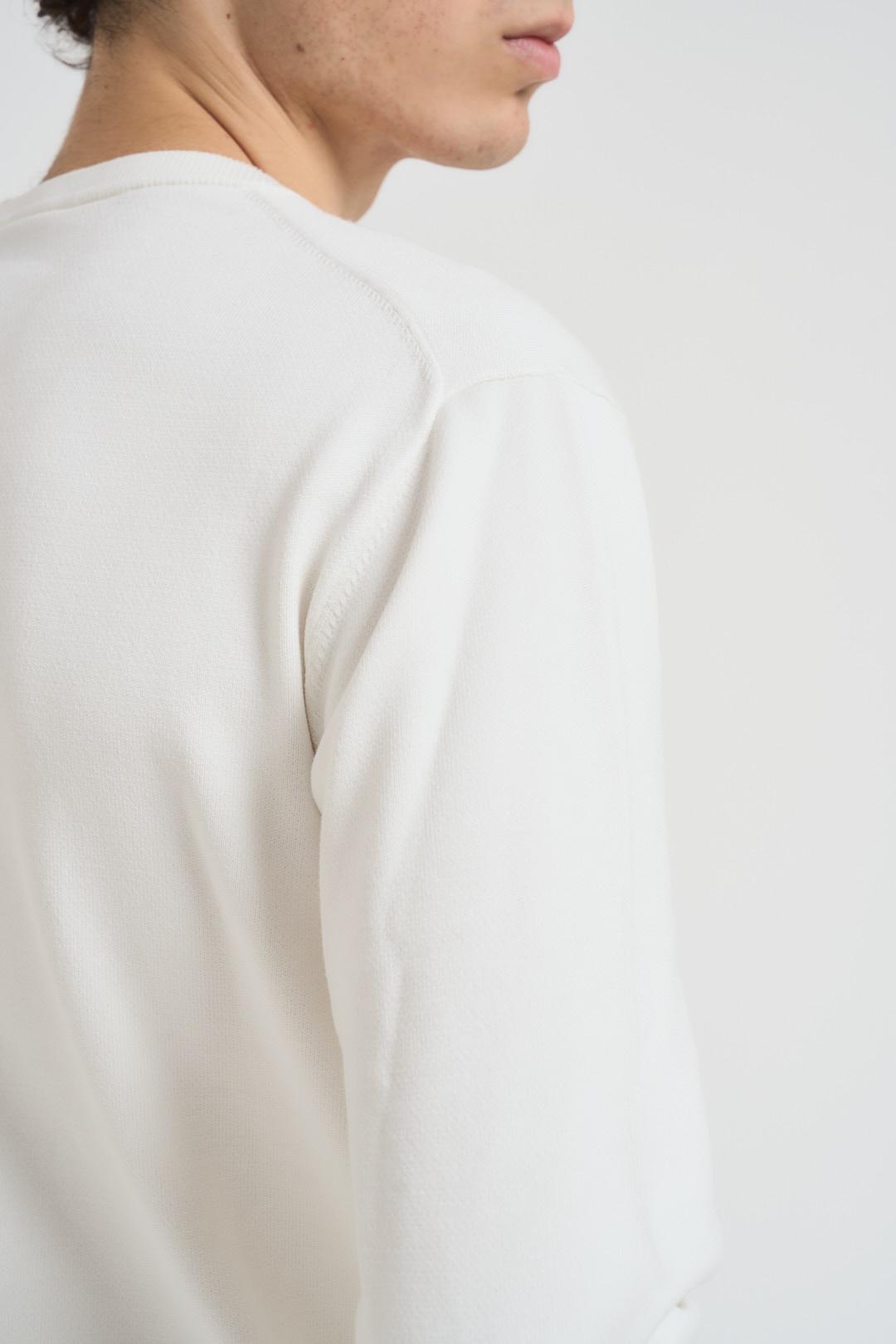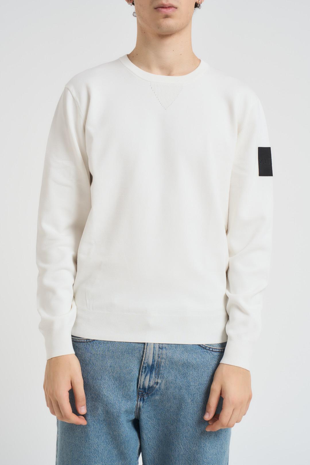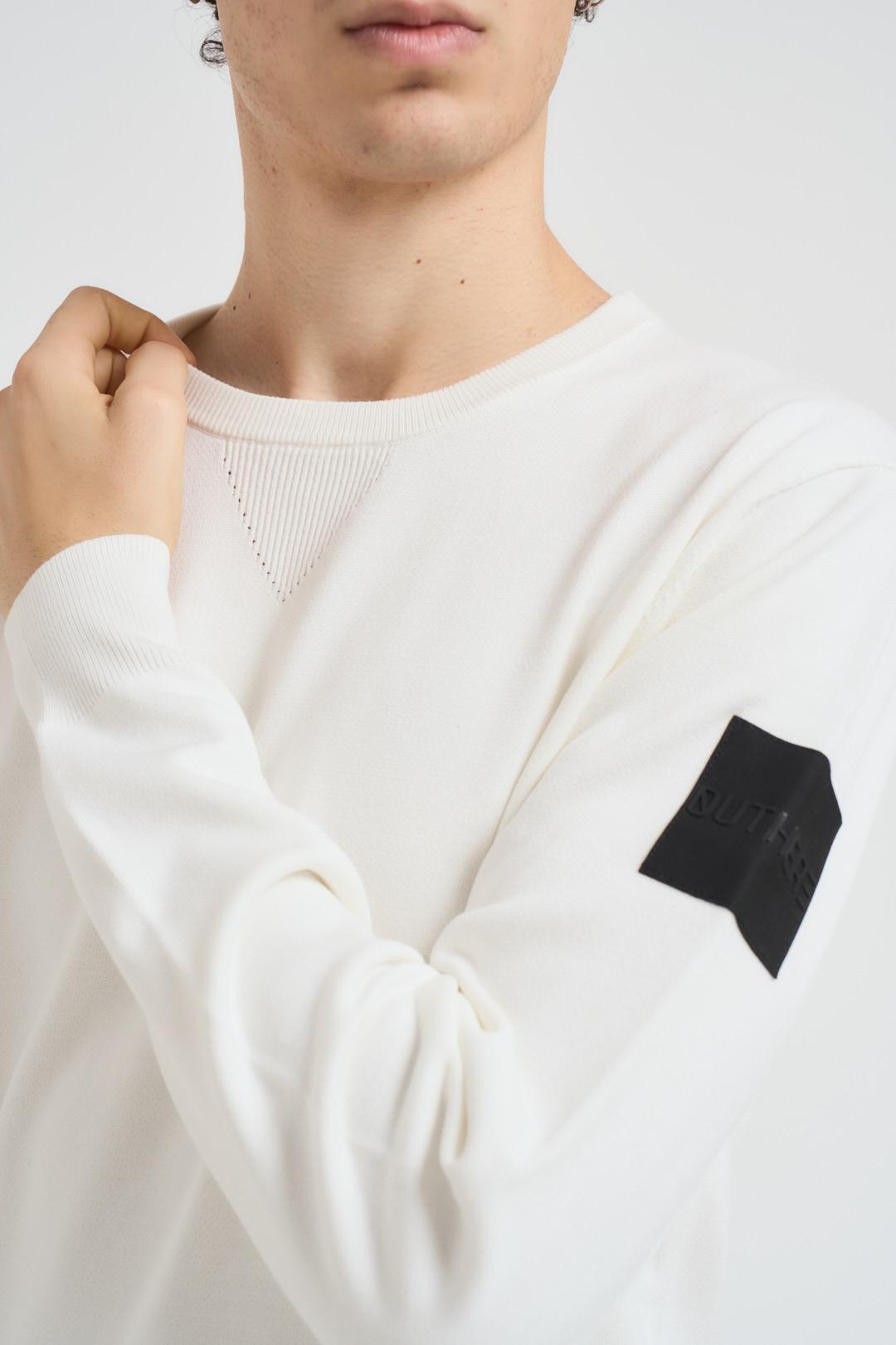 OUTHERE Maglia uomo girocollo bianca. Modello a manica lunga con collo, polsini e fondo a costine. Tag logo in microfibra e gomma a contrasto colore patch sulla manica. Composizione: 72% Viscosa 28% Pbt. Il modello è alto 190 cm e indossa la taglia L.
