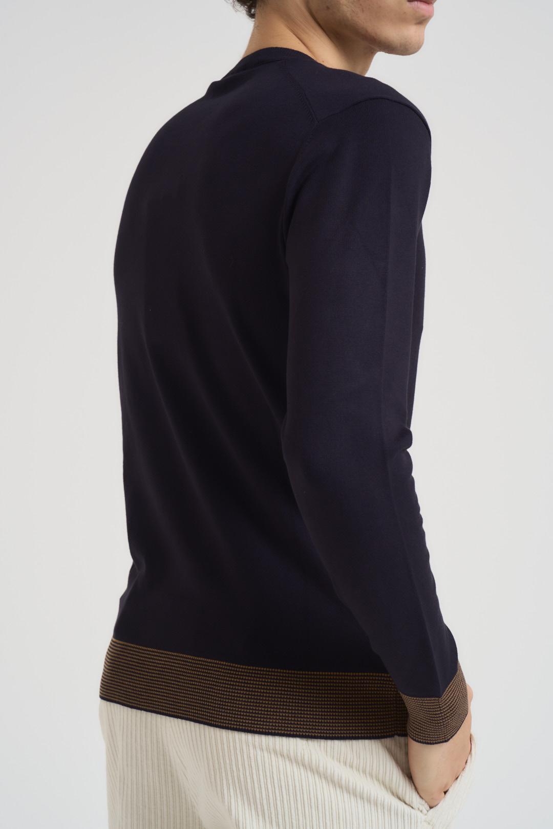 AGOEFILO Maglia uomo girocollo blu. Modello regular fit, con dettaglio orli a righe cammello e nero. Due toppe decorative sul fondo a sinistra. Composizione: 70% viscosa 30% poliammide. Il modello è alto 190cm e indossa la taglia L.
