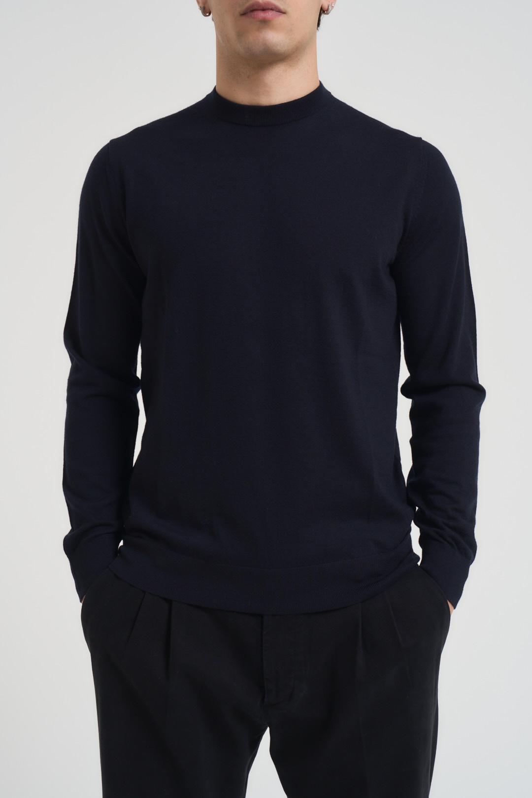 DIKTAT Maglia uomo girocollo blu. Modello con dettagli a costine, regular fit. Composizione: 100% lana merinos. Il modello è alto 190cm e indossa la taglia L.
