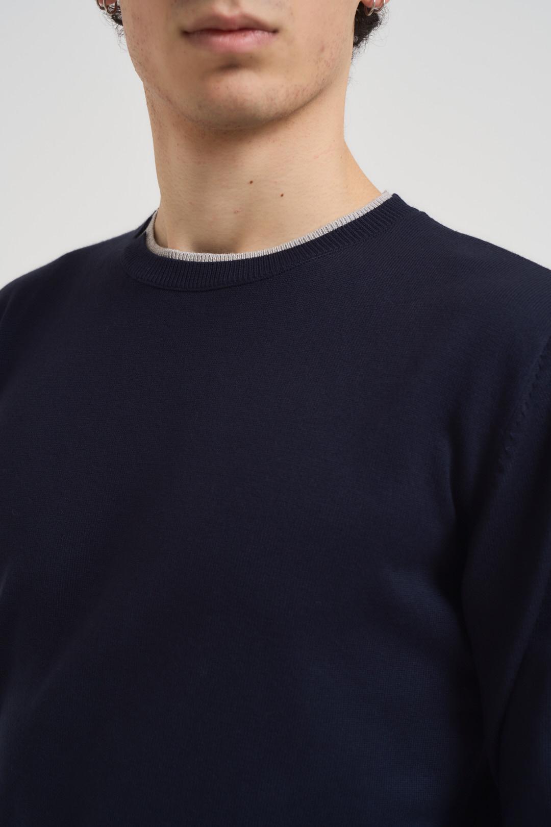 SSEINSE Maglia uomo girocollo blu. Modello a manica lunga con dettagli a costine, regular fit. Doppio polsino/collo grigio chiaro con apertura. Composizione: 70% Viscosa 30% Nylon. Il modello è alto 190cm e indossa la taglia L.
