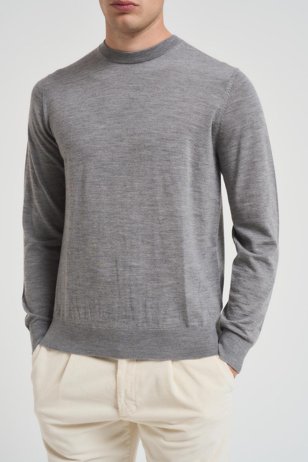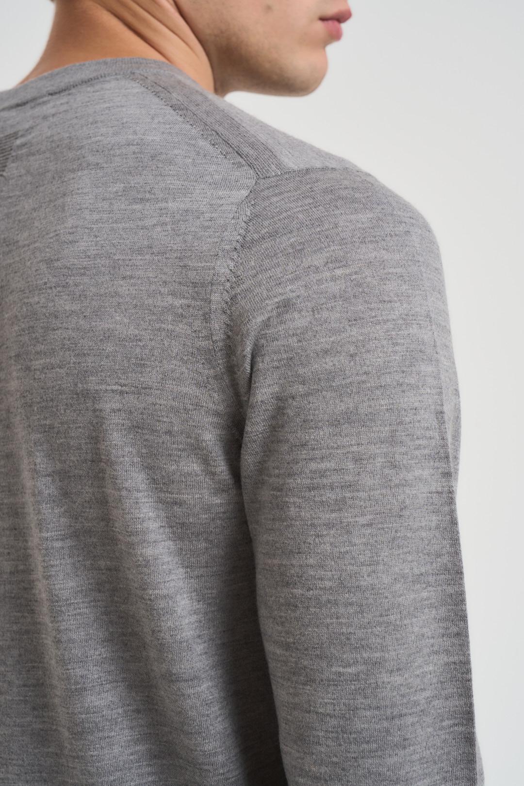 DIKTAT Maglia uomo girocollo grigio chiaro. Modello con dettagli a costine, regular fit. Composizione: 100% lana merinos. Il modello è alto 190cm e indossa la taglia L.
