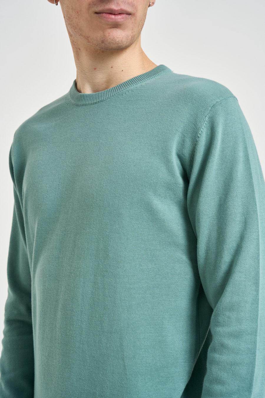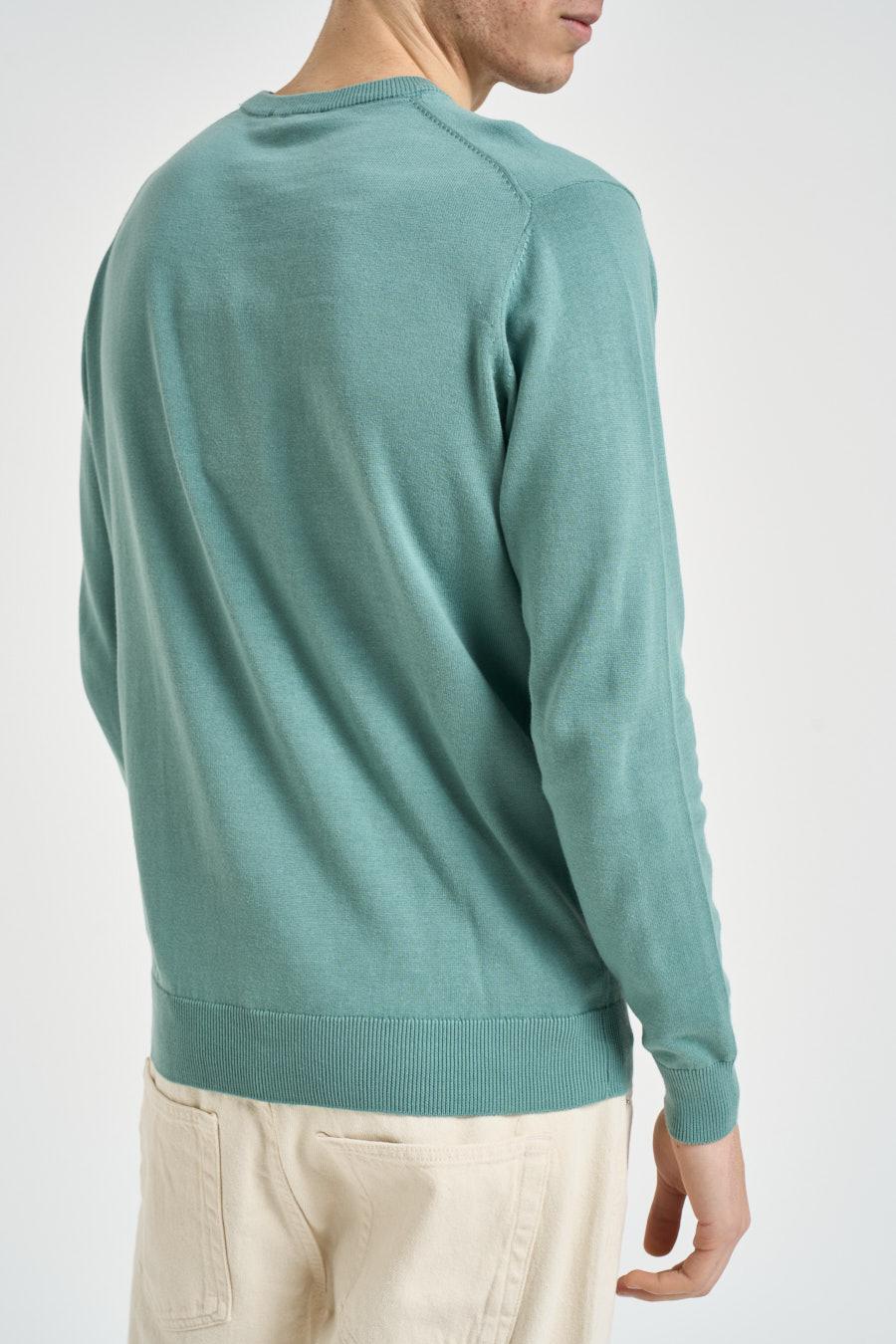 VITTORIO FERRIERI Maglia uomo girocollo menta. Modello maniche lunghe, finiture a costine su collo, polsi e fondo che valorizzano la silhouette. Composizione: 100% Cotone. Il modello è alto 190 cm e indossa la taglia L.