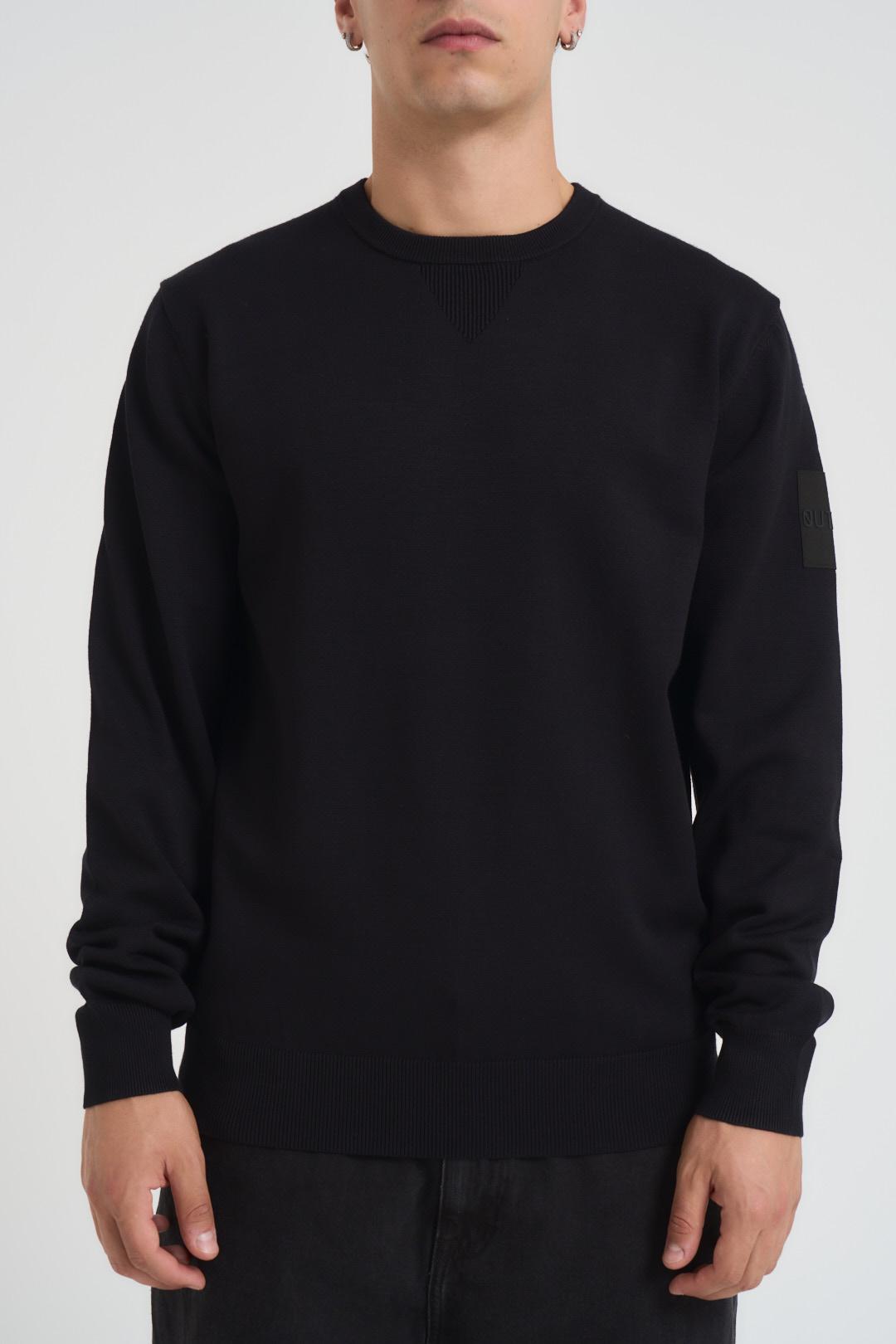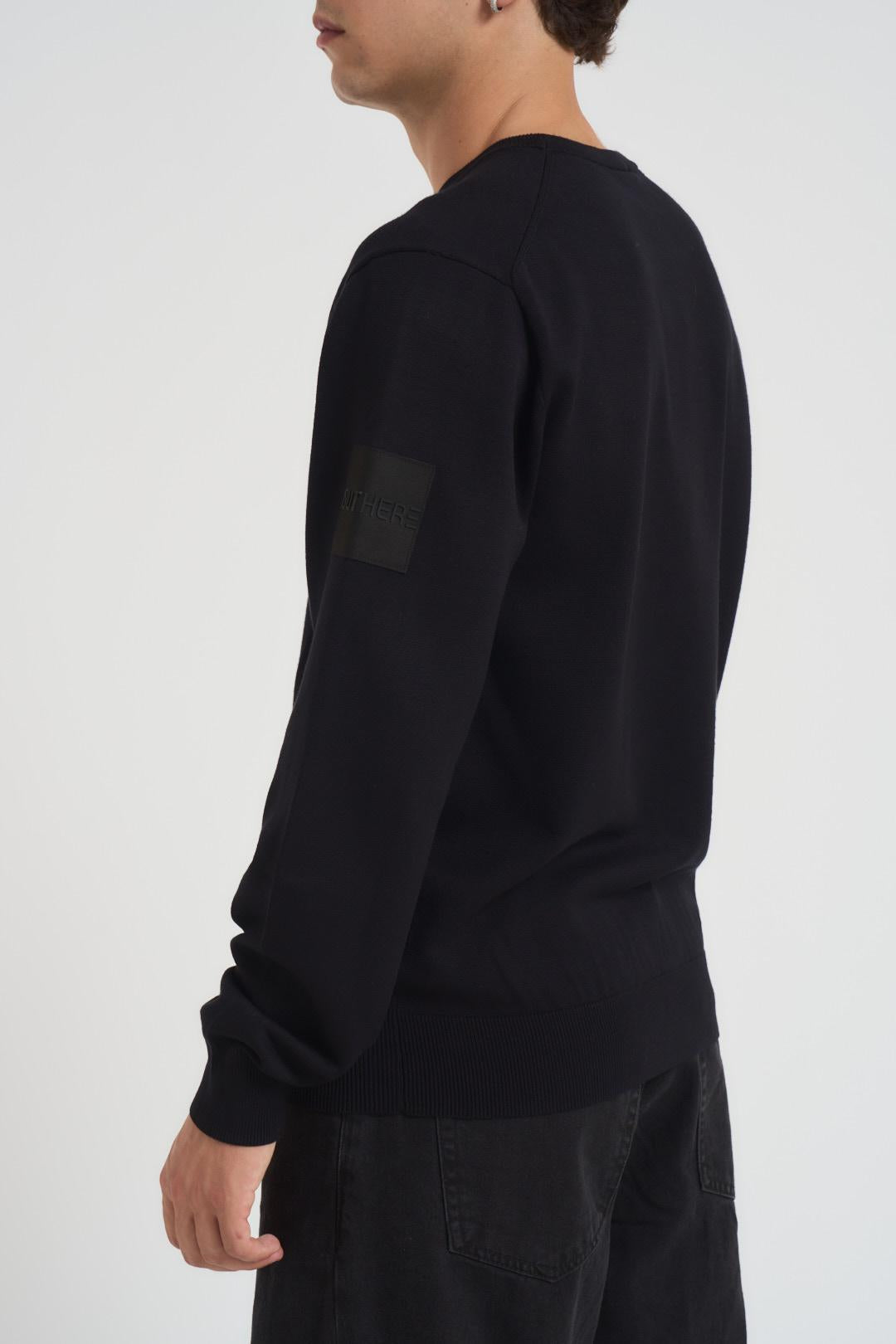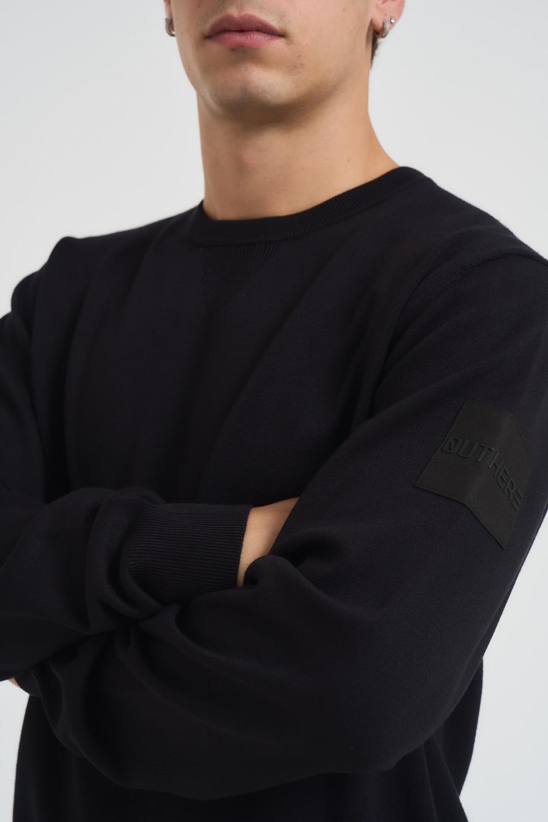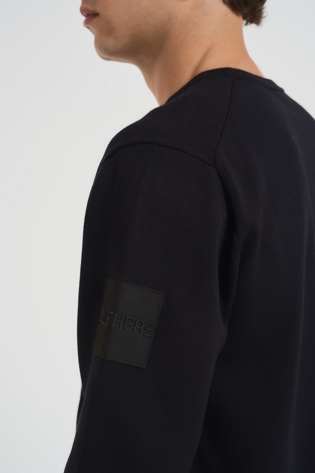 OUTHERE Maglia uomo girocollo nera. Modello a manica lunga con collo, polsini e fondo a costine. Tag logo in microfibra e gomma a contrasto colore patch sulla manica. Composizione: 72% Viscosa 28% Pbt. Il modello è alto 190 cm e indossa la taglia L.