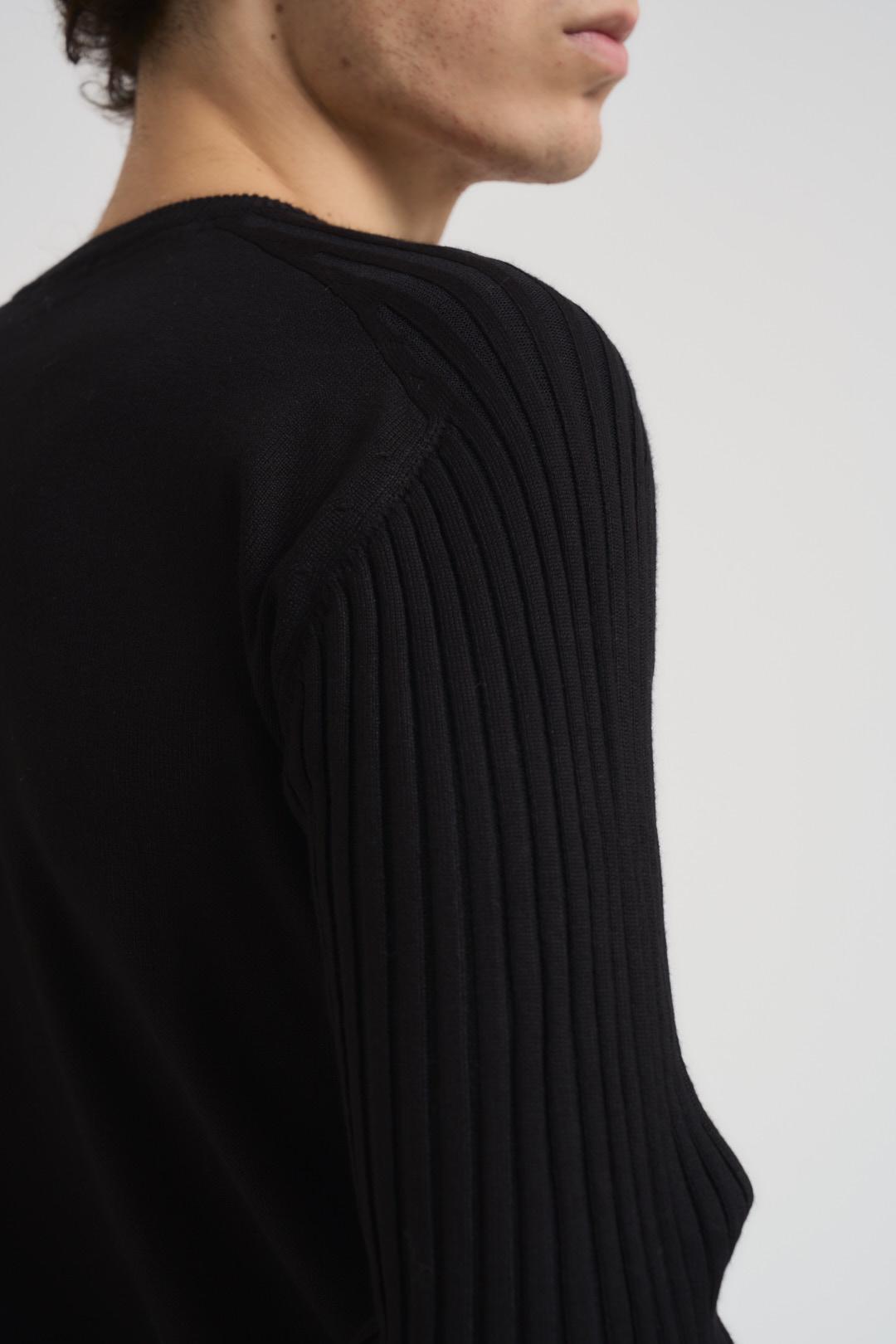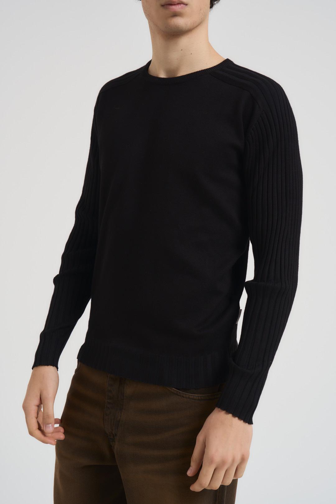 SSEINSE Maglia uomo girocollo nera. Modello con manica a coste e base in maglia liscia. Composizione: viscosa e poliestere. Il modello è alto 190cm e indossa la taglia L.