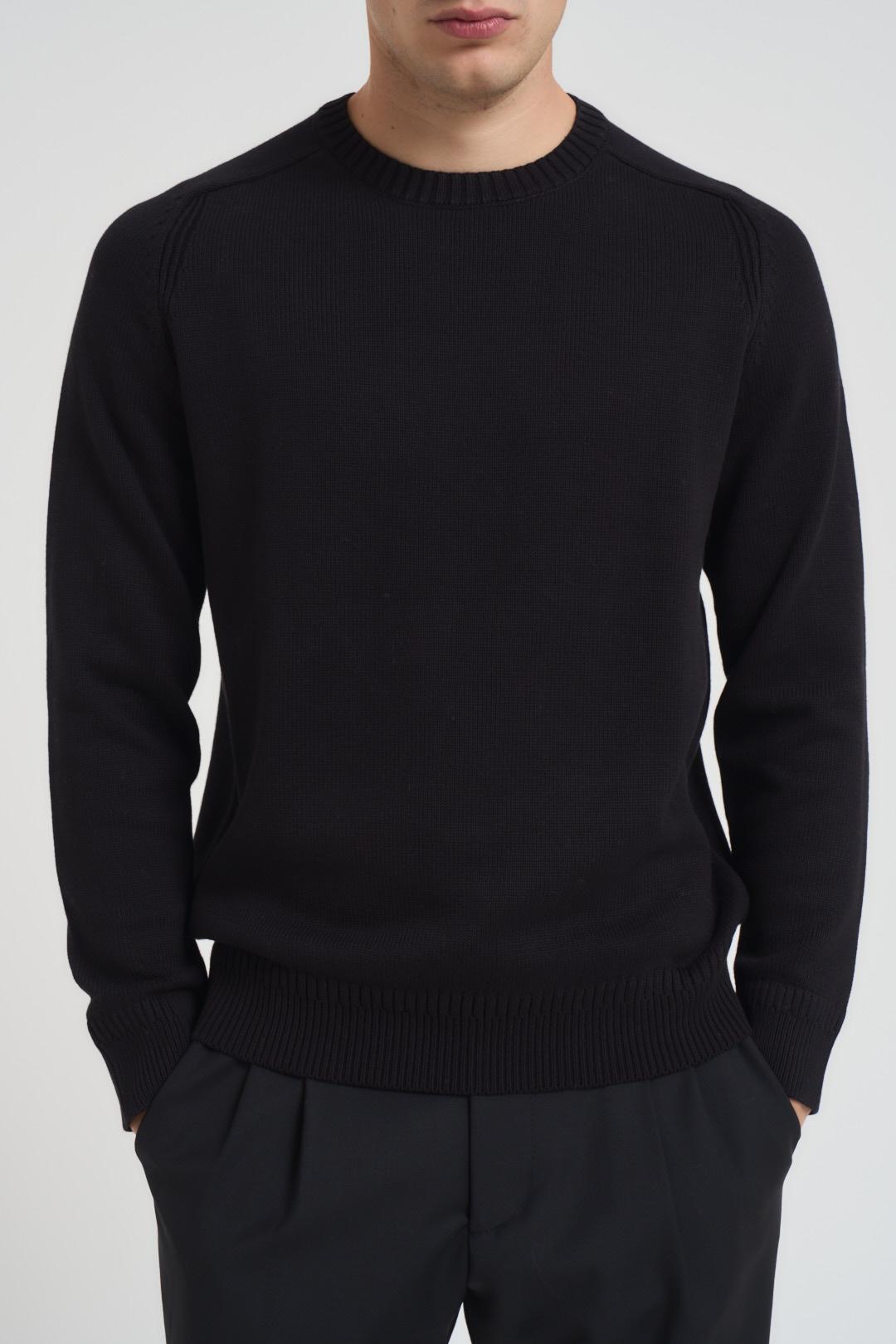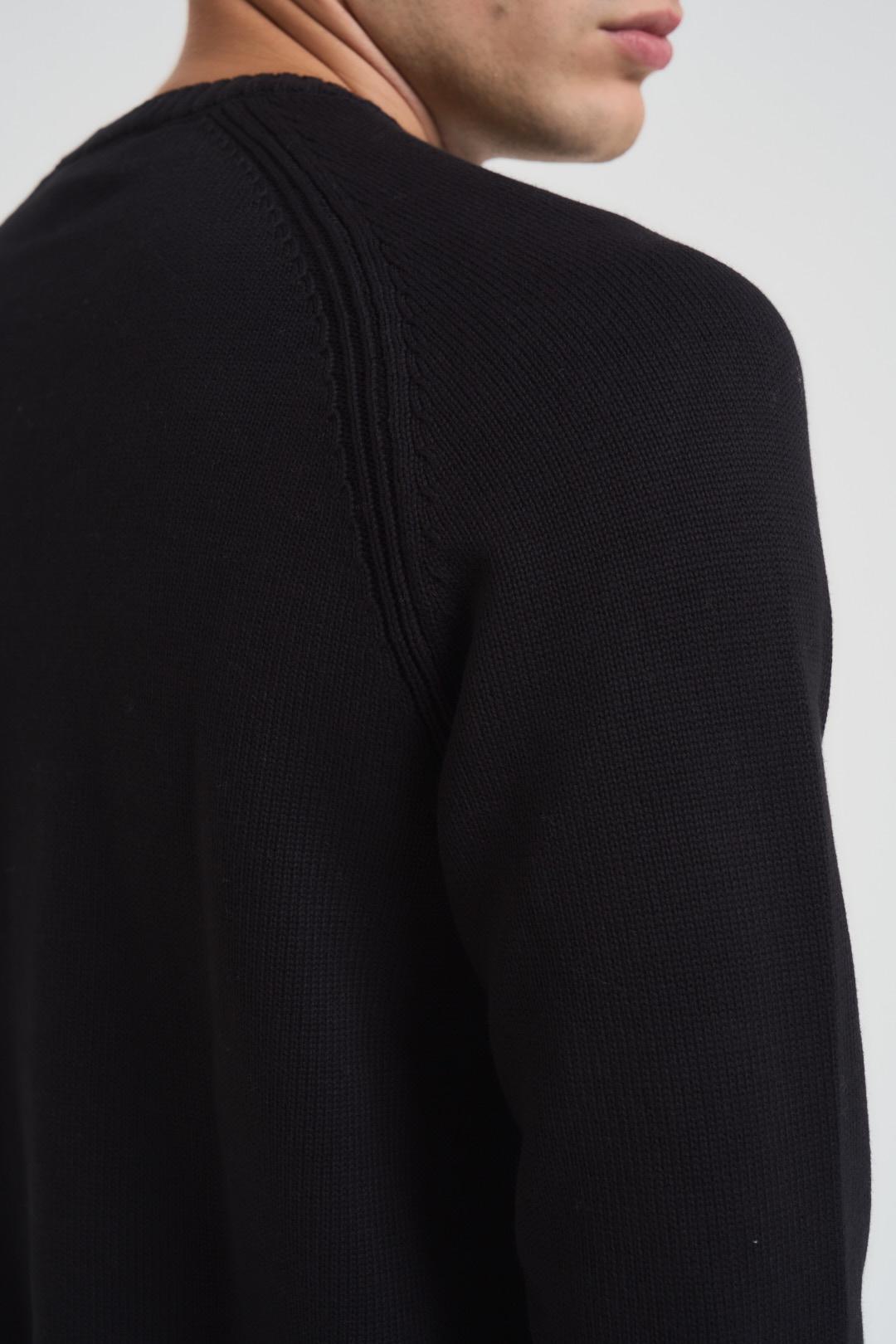 DIKTAT Maglia uomo girocollo nero. Modello manica lunga con dettagli a costine e orli a vista. Composizione: 100% caldo cotone. Il modello è alto 190cm e indossa la taglia L.