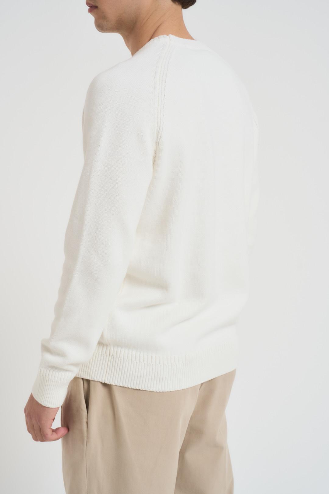 DIKTAT Maglia uomo girocollo panna. Modello manica lunga con dettagli a costine e orli a vista. Composizione: 100% caldo cotone. Il modello è alto 190cm e indossa la taglia L.