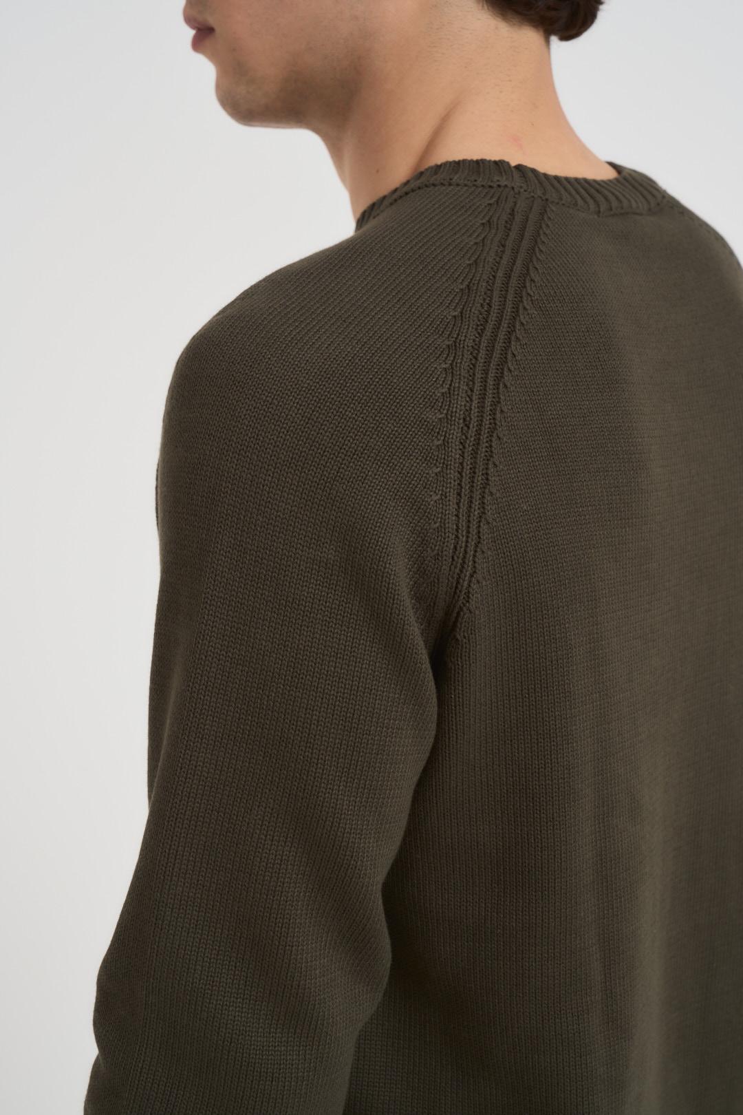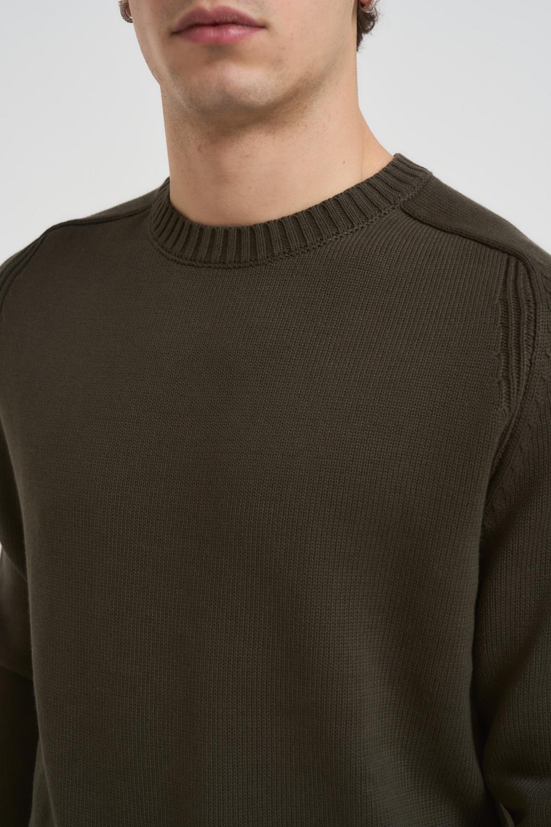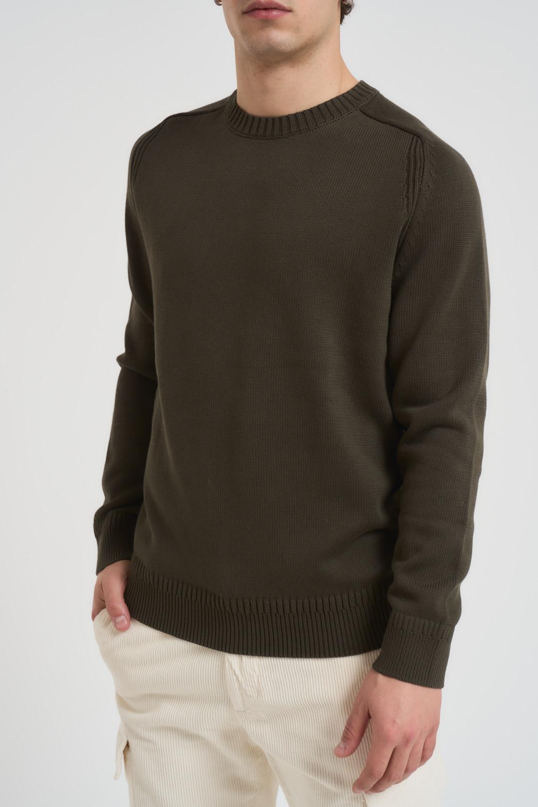 DIKTAT Maglia uomo girocollo verde militare. Modello manica lunga con dettagli a costine e orli a vista. Composizione: 100% caldo cotone. Il modello è alto 190cm e indossa la taglia L.