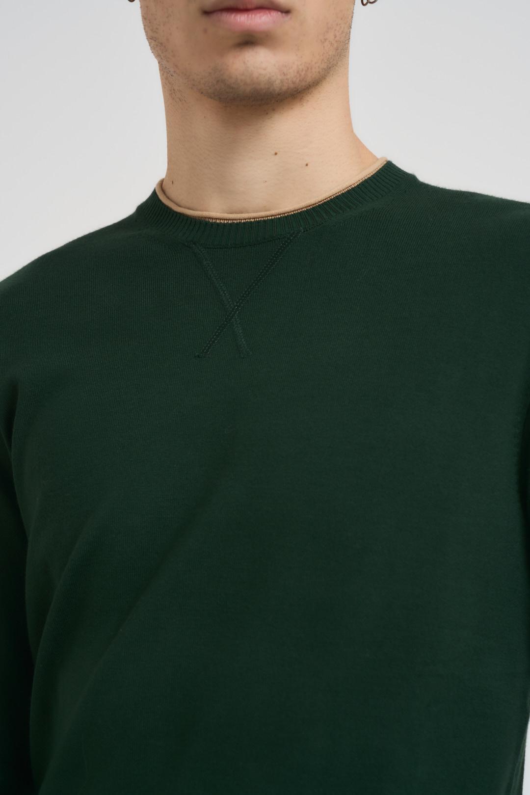 MARKUP Maglia uomo girocollo verde. Modello a manica lunga con toppe in viscosa sui gomiti, dettagli a costine. Composizione: 80% Viscosa, 20% Nylon. Il modello è alto 190cm e indossa la taglia L.