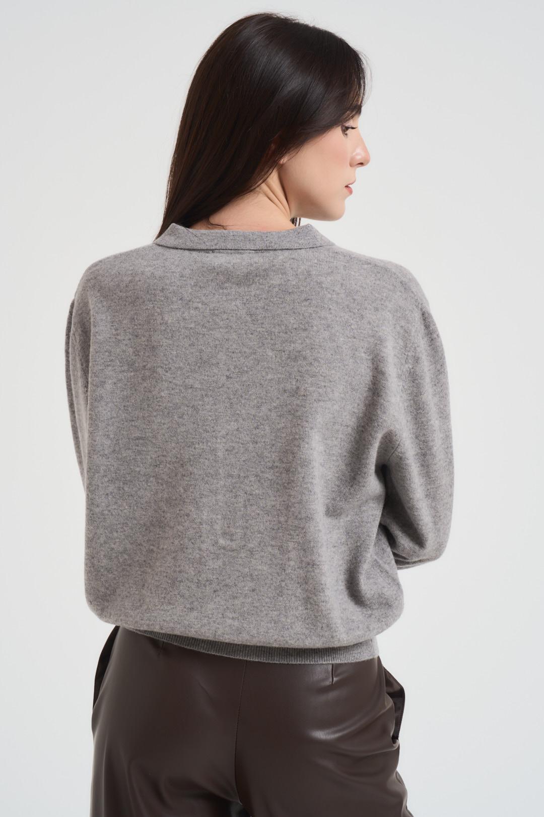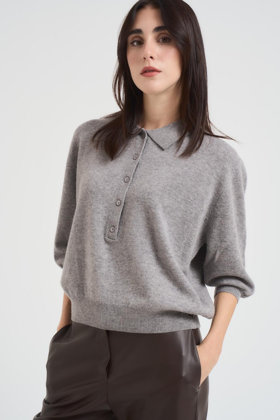DIXIE Maglione pullover donna collo polo grigio. Modello con manica a tre quarti. Composizione: 100% Lana. La modella è alta 175 cm e indossa la taglia S.