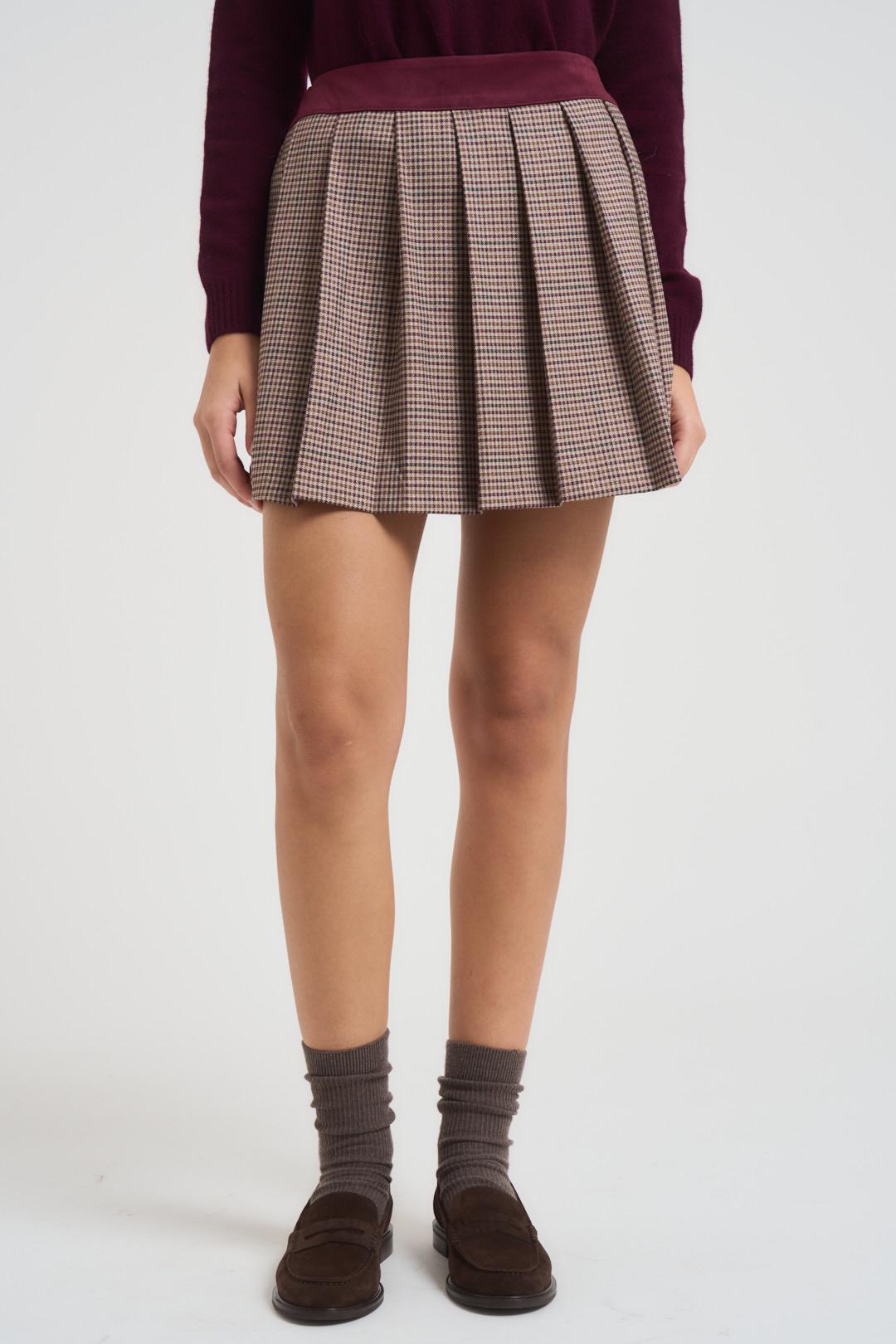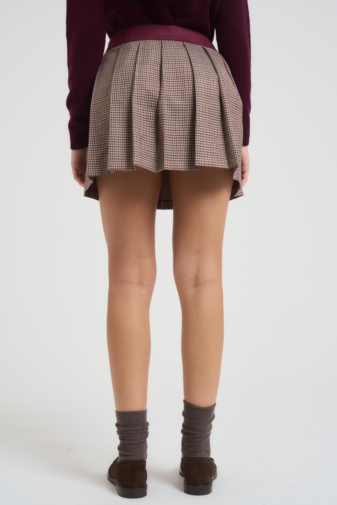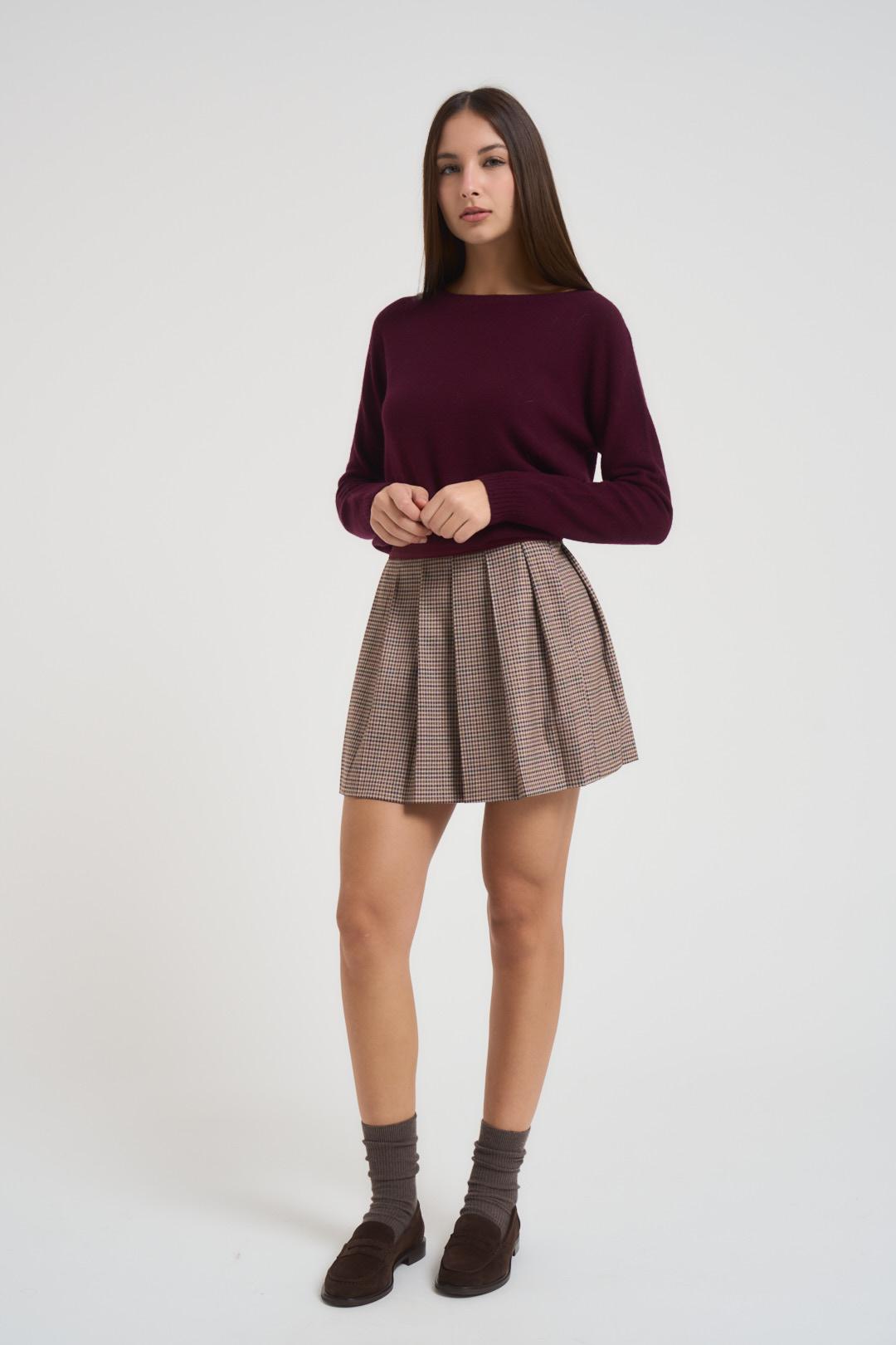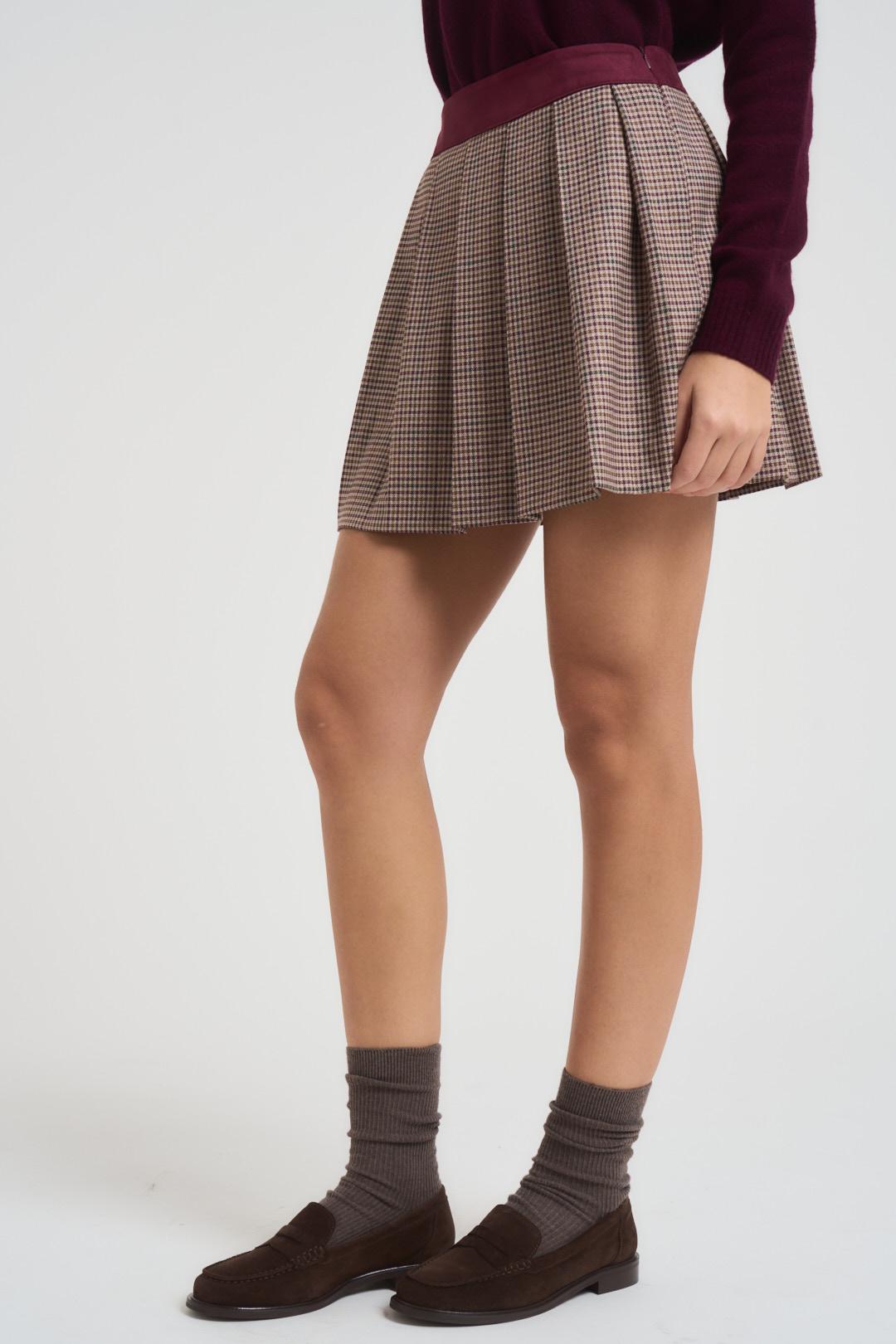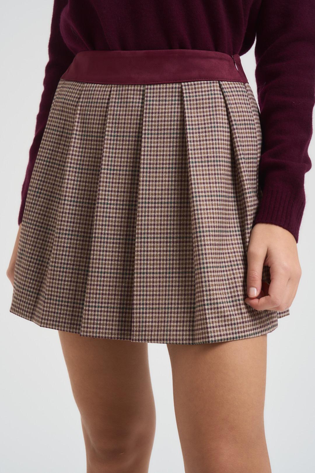 SUSY MIX Minigonna donna a pieghe in pied de poule vino. Modello con apertura con zip laterale, fascia in vita. Composizione: Composizione: 62% poliestere, 35% viscosa, 3% elastan. La modella è alta 176 cm e indossa la taglia S.