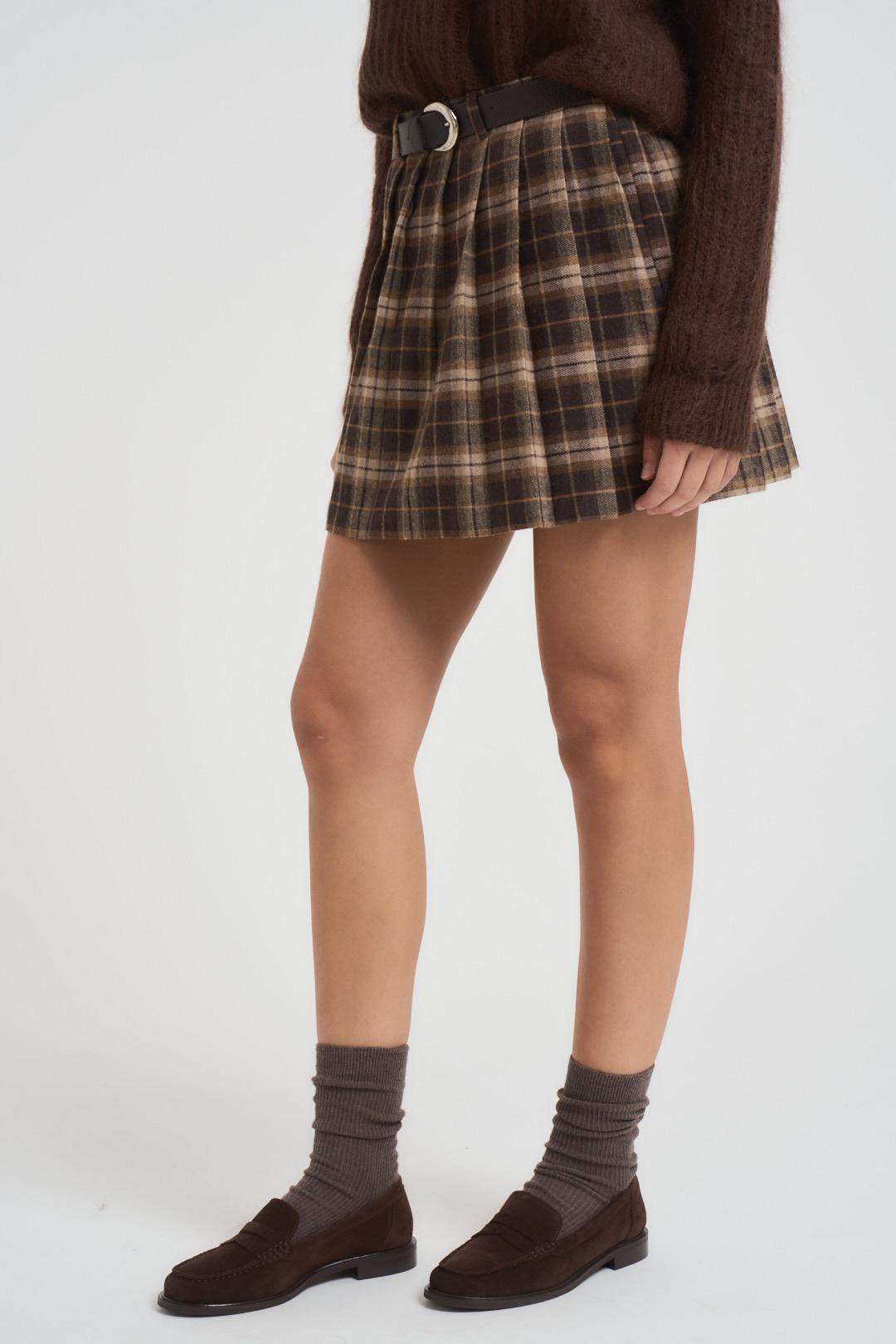 SUSY MIX Minigonna donna a pieghe moro. Modello in flanella con stampa check. Chiusura con zip laterale. Passanti in vita e cintura in dotazione. Composizione: 65% cotone, 30% poliestere, 5% altre fibre. La modella è alta 176 cm e indossa la taglia S.