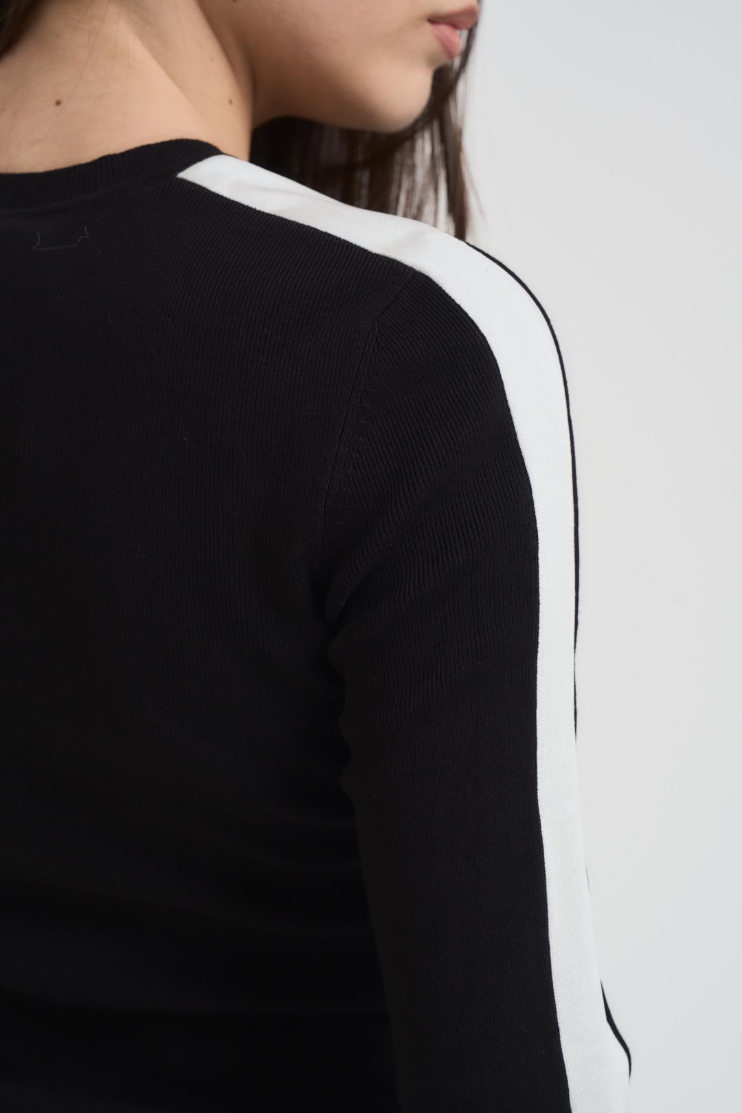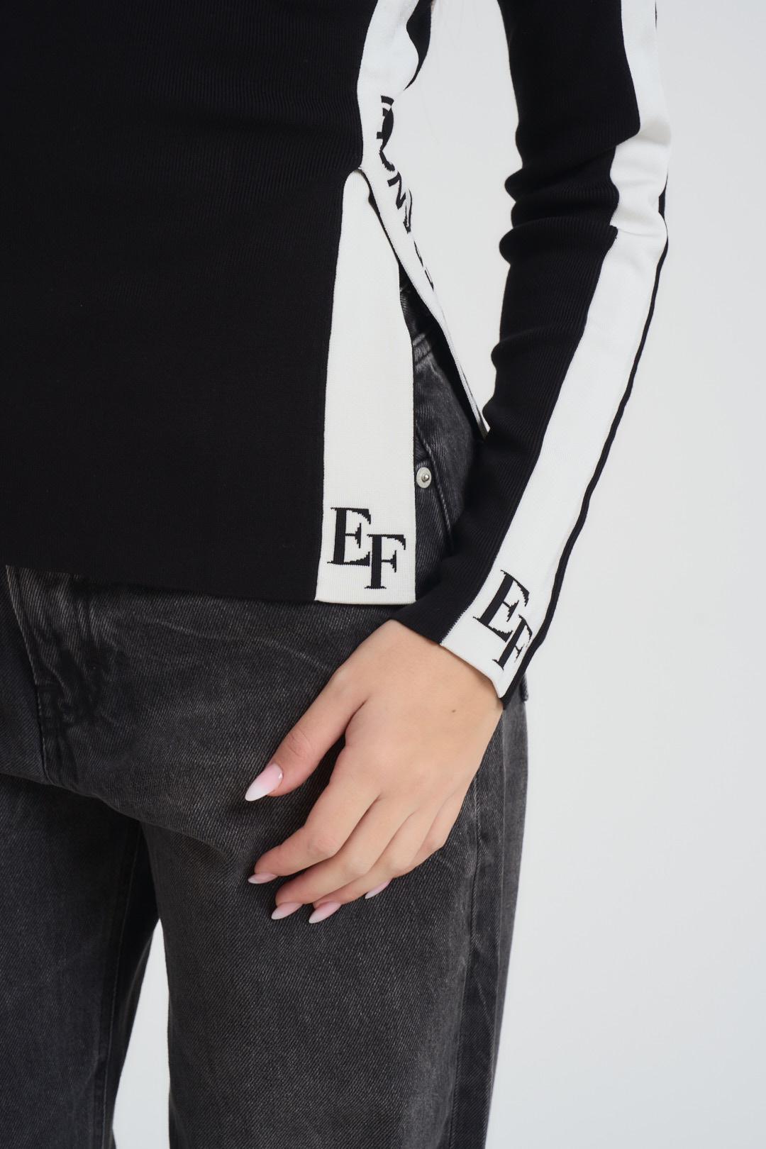 ELISABETTA FRANCHI Maglia donna girocollo bianca e nera. Modello in maglia fina con dettagli strisce bianche sulle maniche con monogram su polsino. Composizione: misto viscosa. La modella è alta 172cm e indossa la taglia 40.